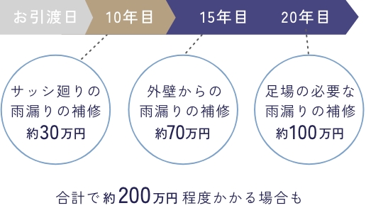 一般的なケースでは、60万円〜90万円程度の補修費用が必要となります。場合によっては、200万円以上の補修費用がかかることもあります。当社では、お引き渡し後20年間、突然の不具合発生時にも、費用負担なく補修させていただきます。