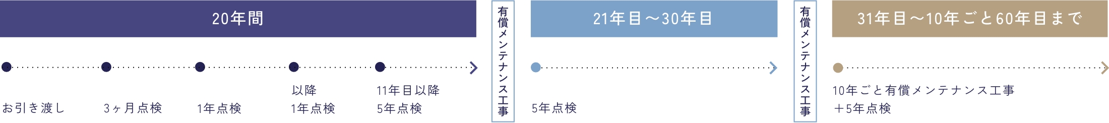 D&Hでは建物お引き渡しから3ヶ月・1年後、以降10年目まで毎年1回、11年目から60年目まで5年に1回点検を継続して実施しております。点検には専門スタッフがお伺いし、検診・メンテナンス箇所のアドバイスを行います。