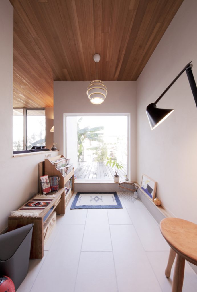 リビング窓は天井と同じ高さで、外とフラットにつながる。小高い立地にあって庭木も目隠しになっているため、あえてカーテンはつけていないそう。