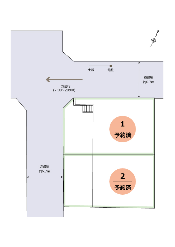 | 道路 | 公道:北西側 約6.7m※一方通行(7:00~20:00) 公道:南西側 約6.7m |