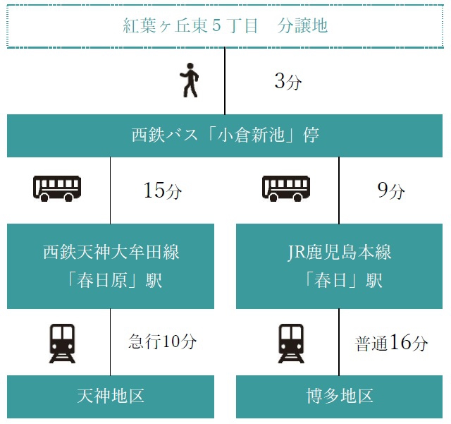 徒歩3分の小倉新池バス停から西鉄春日原駅やJR春日駅、どちらもアクセス可能◎