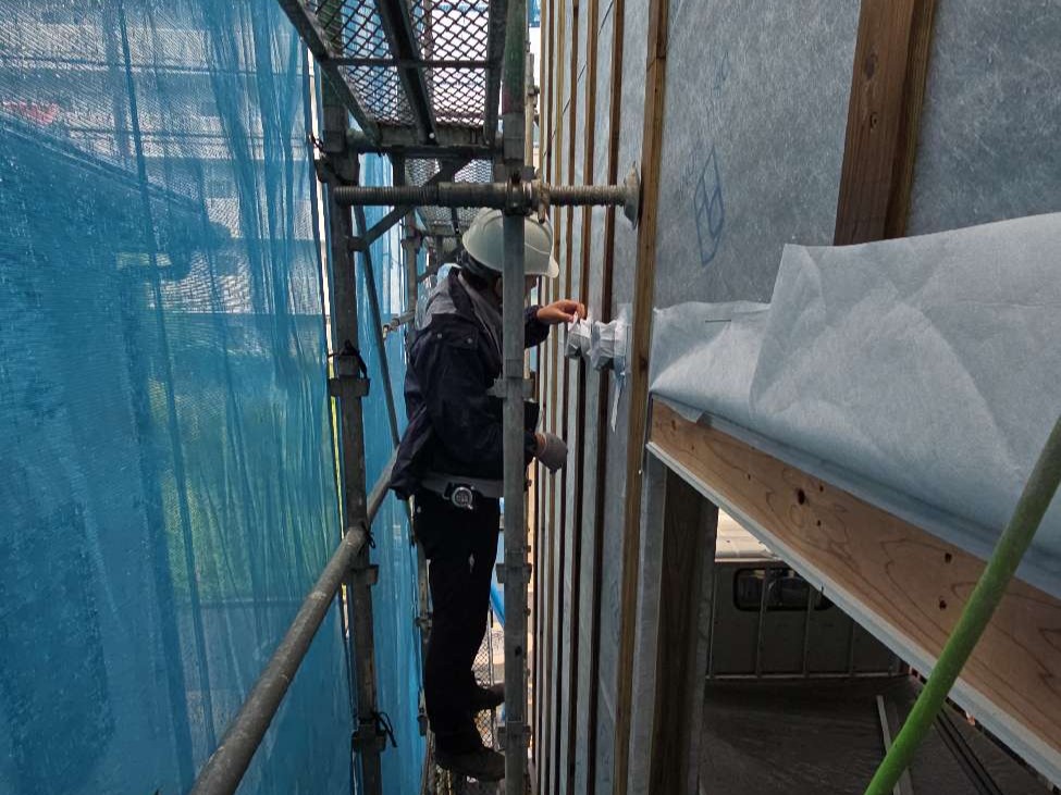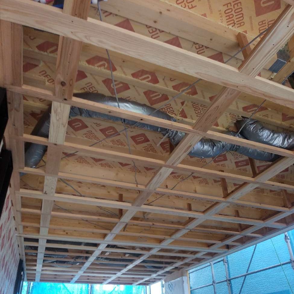 外壁の断熱工事が進んでいます。弊社ではネオマフォームと呼ばれる厚さ30㎜の断熱材(屋根は80㎜)を施します。また、気密性を高めるため、継ぎ目を専用テープで塞ぎます。