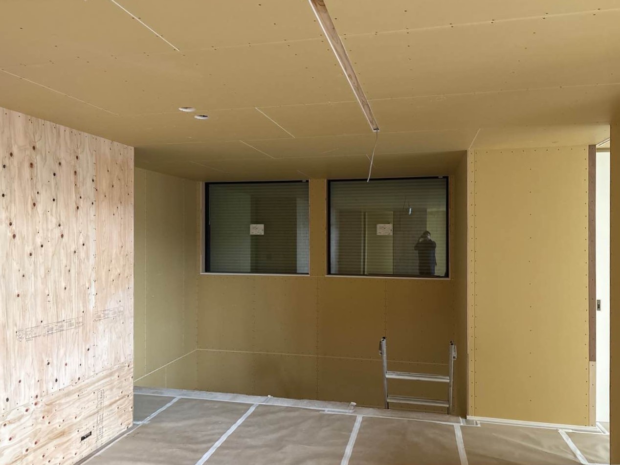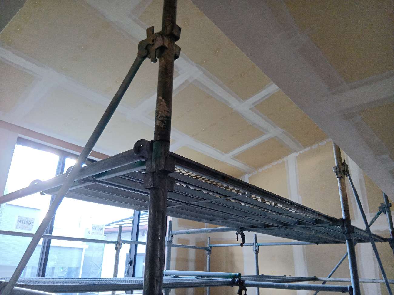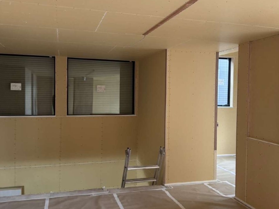 クロス工事に取り掛かりました。石膏ボードにパテ処理を施し、平滑な面をつくります。