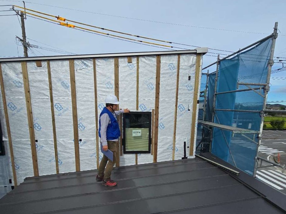 第三者機関である日本住宅保証検査機構(JIO)様の防水下地検査を受けました。断熱材の上に貼ったアクアシルバーウォールシングル(遮熱透湿防水シート)の状態等、各所雨漏りしないかを確認します。