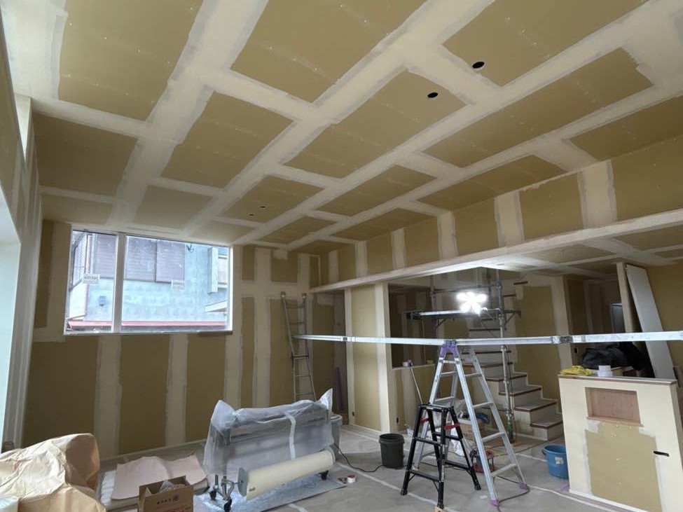 クロス工事に取り掛かりました。石膏ボードにパテ処理を施し、平滑な面をつくります。