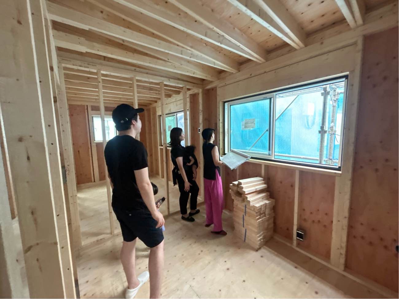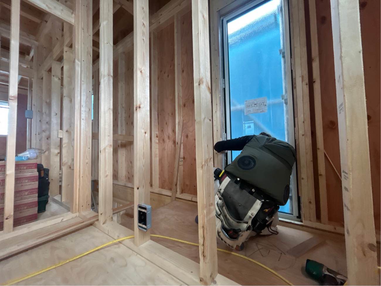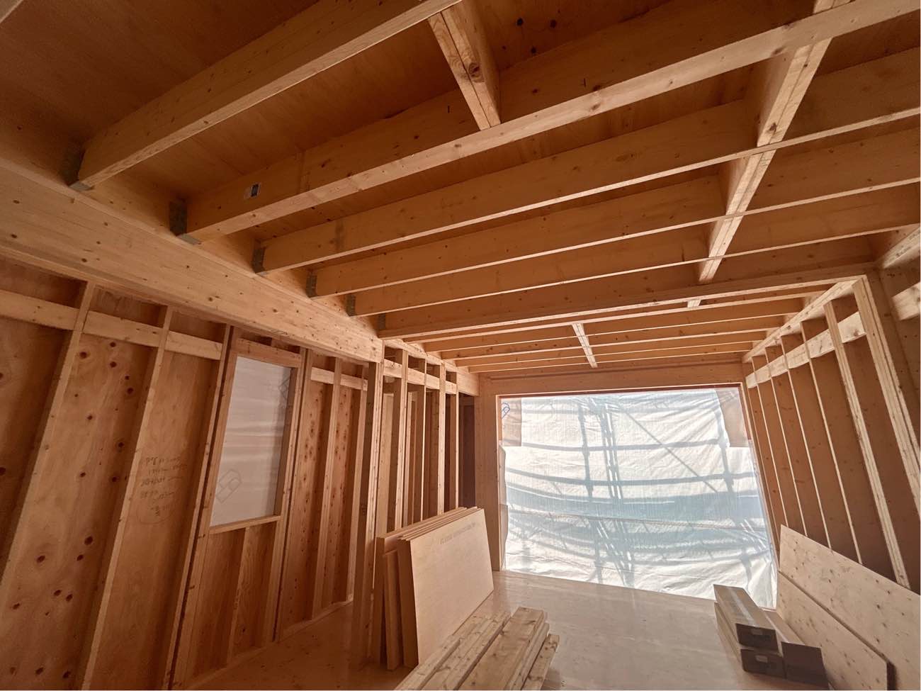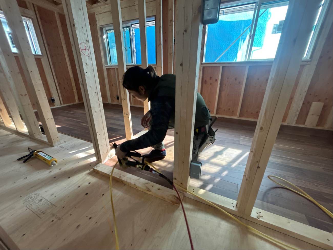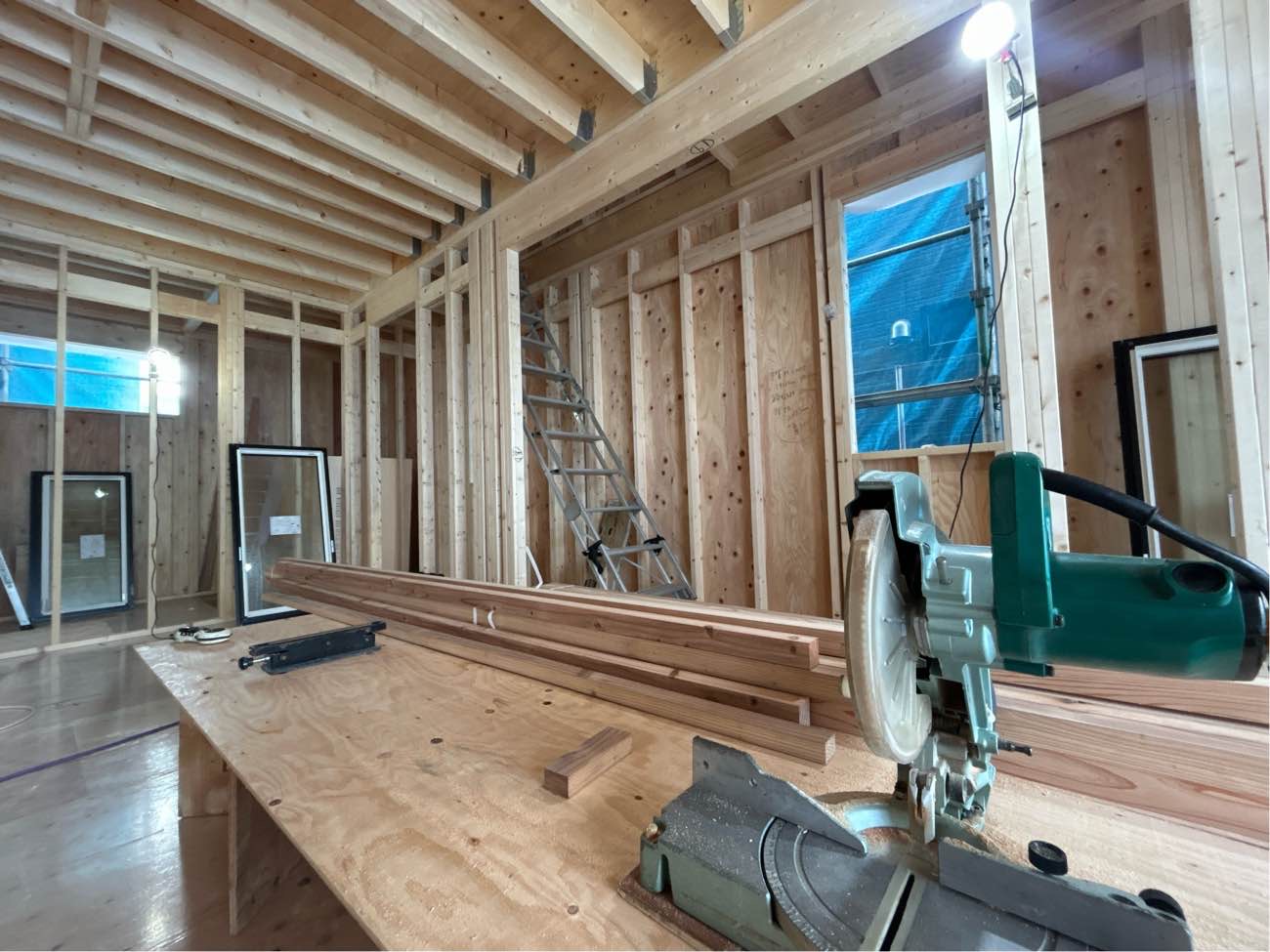 内部造作工事がはじまりました。サッシを取り付け、各所下地工事やフローリング工事へ進んでいきます。