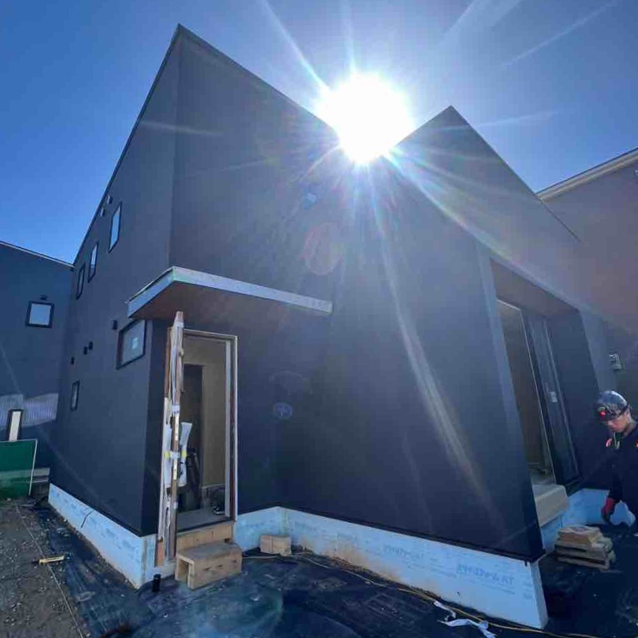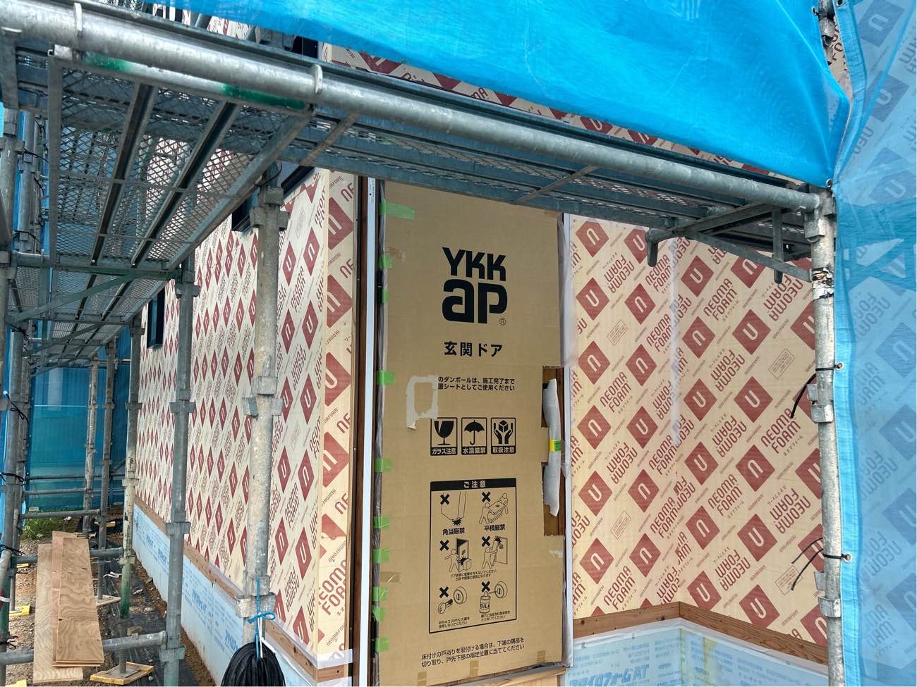 外壁の断熱工事が進んでいます。弊社ではネオマフォームと呼ばれる厚さ30㎜の断熱材(屋根は80㎜)を施します。また、気密性を高めるため、継ぎ目を専用テープで塞ぎます。