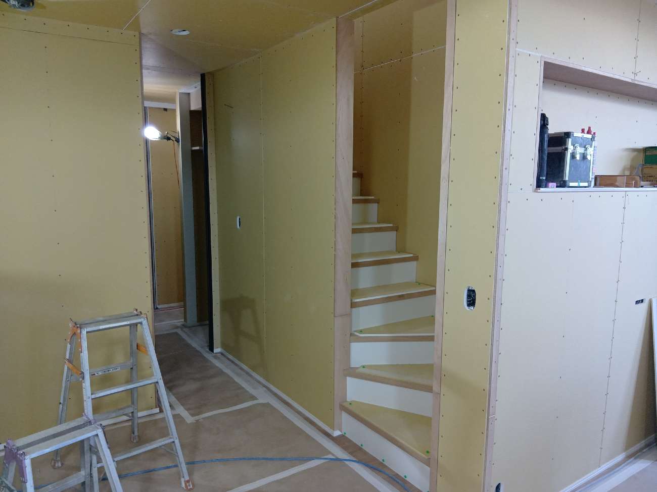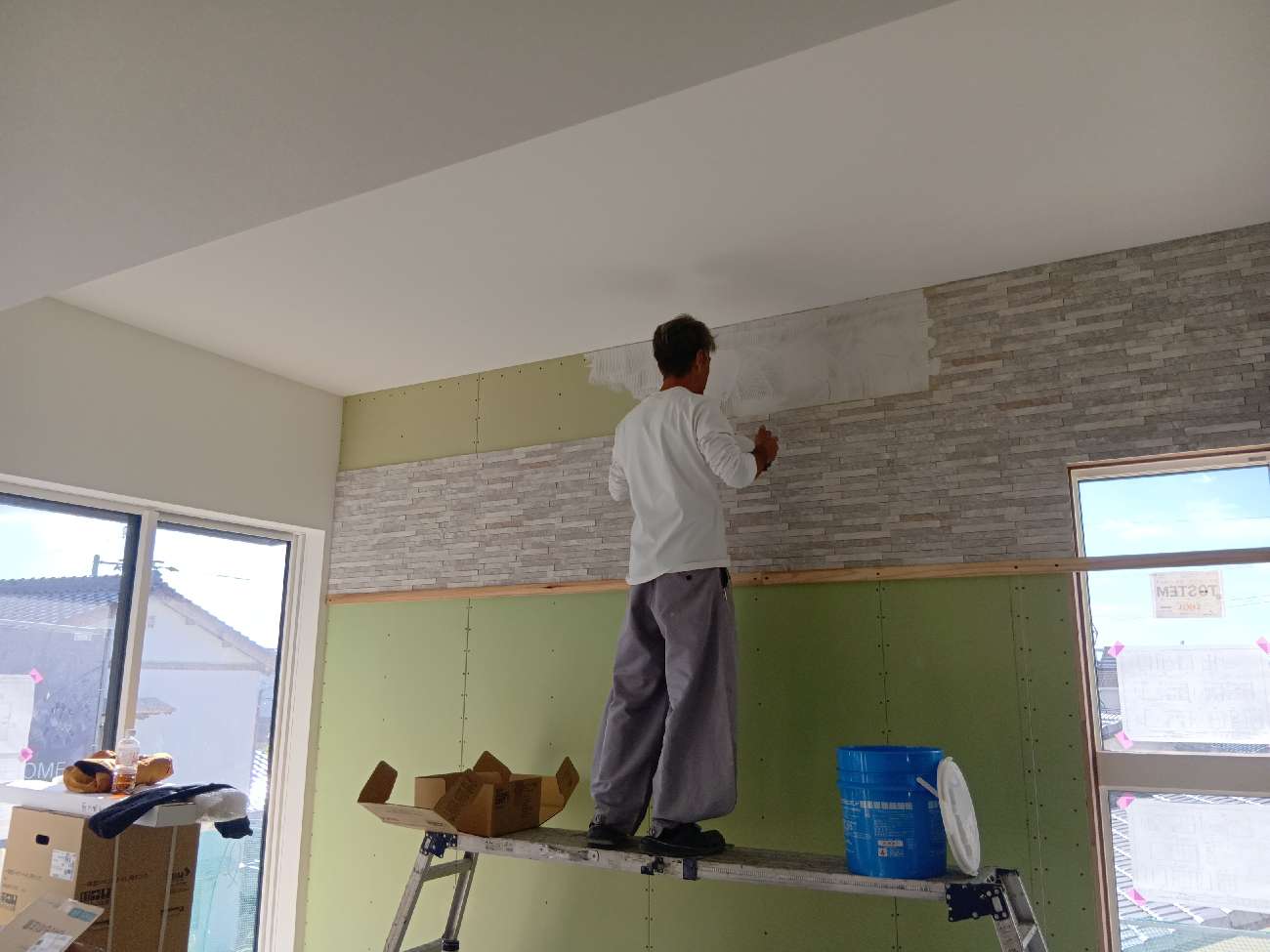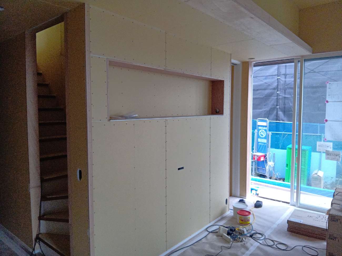 クロス工事が進んでいます。石膏ボードにパテ処理を施して平滑な面をつくり、壁紙を張っていきます。