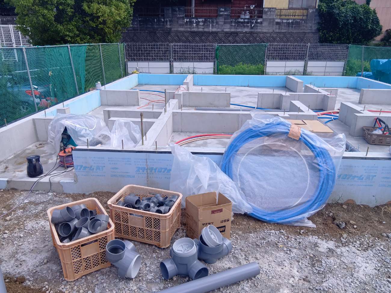 建物基礎が完成しました。床下の設備配管を行った後、構造躯体工事の準備に取り掛かります。