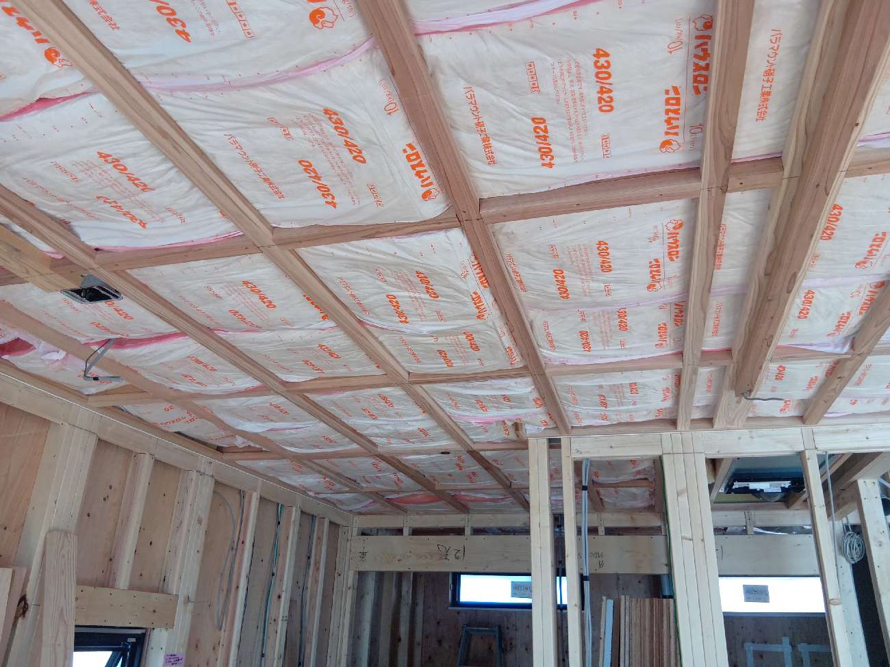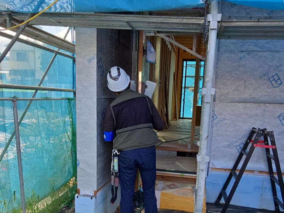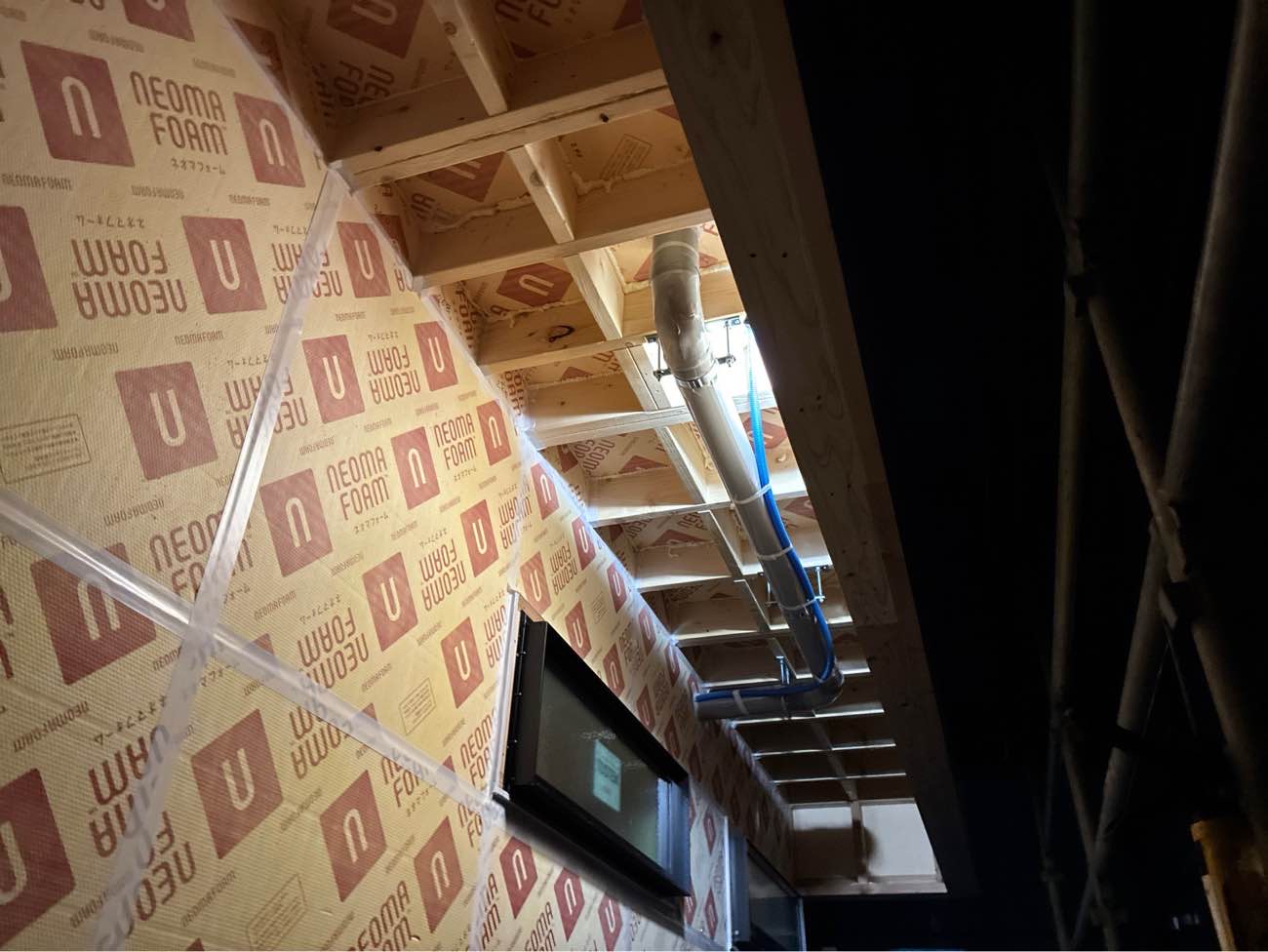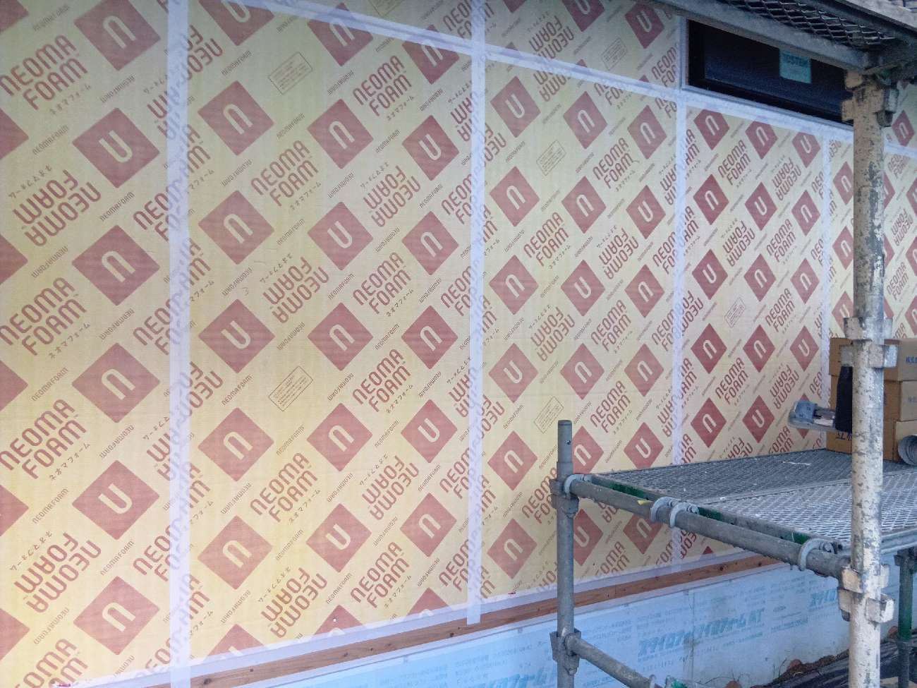 外壁の断熱工事が進んでいます。弊社ではネオマフォームと呼ばれる厚さ30㎜の断熱材(屋根は80㎜)を施します。また、気密性を高めるため、継ぎ目を専用テープで塞ぎます。