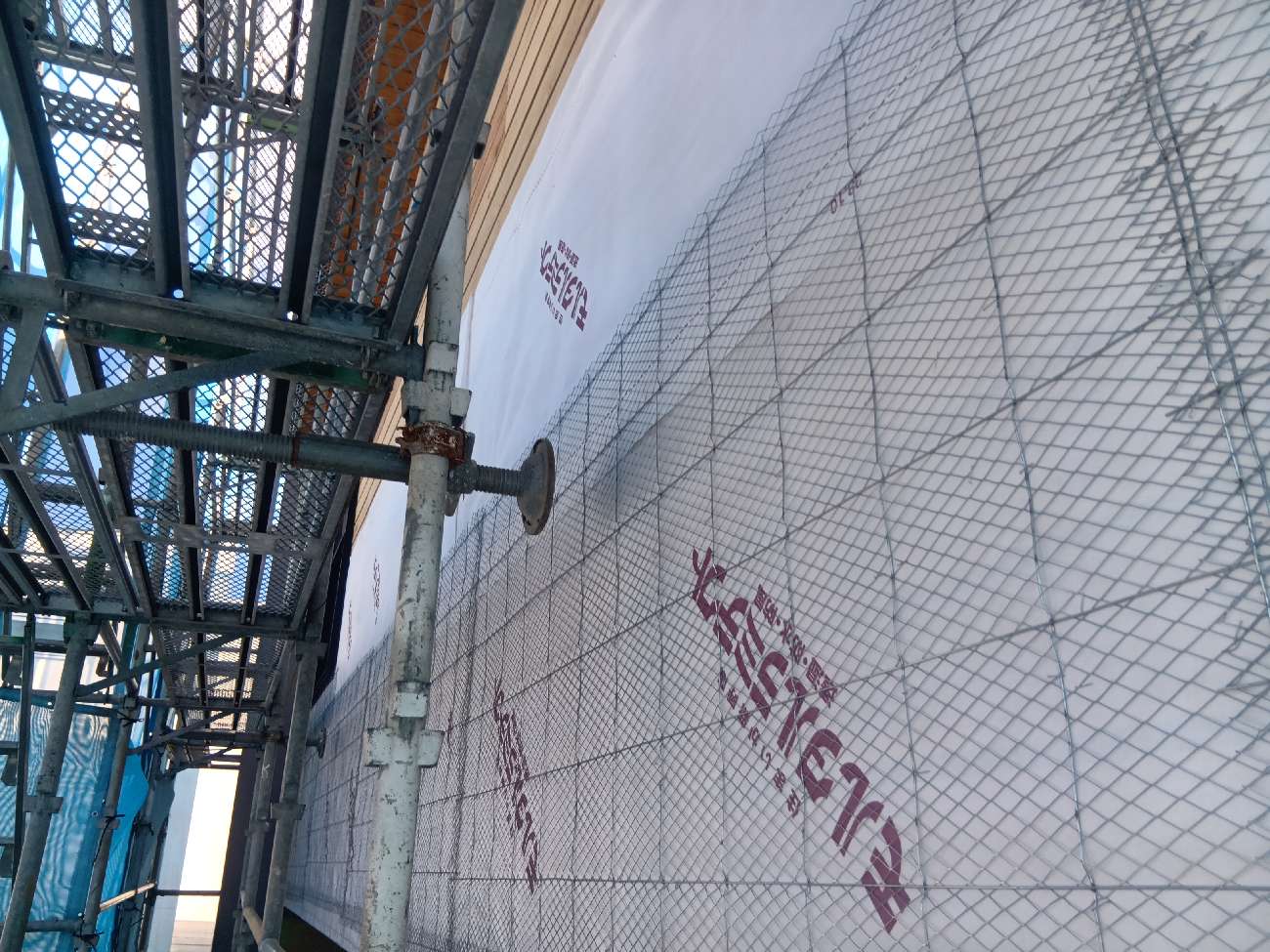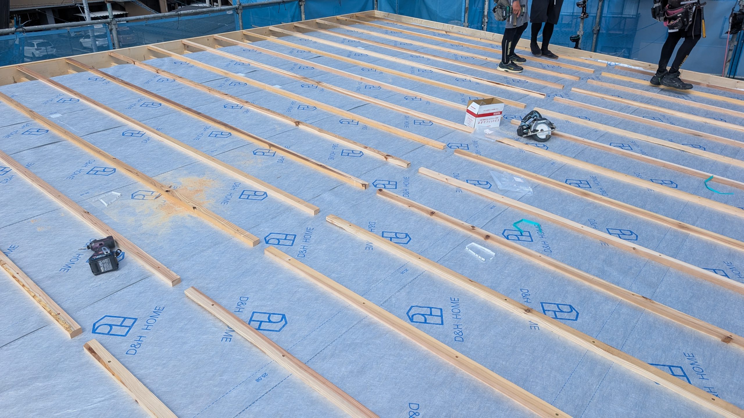 第三者機関である日本住宅保証検査機構(JIO)様の防水下地検査を受けました。断熱材の上に貼ったアクアシルバーウォールシングル(遮熱透湿防水シート)の状態等、各所雨漏りしないかを確認します。