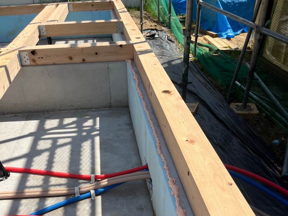 躯体工事に取り掛かりました。基礎の上に土台材を敷き、28㎜の合板を敷き込んで専用の釘で止めていきます。この後いよいよ上棟です!