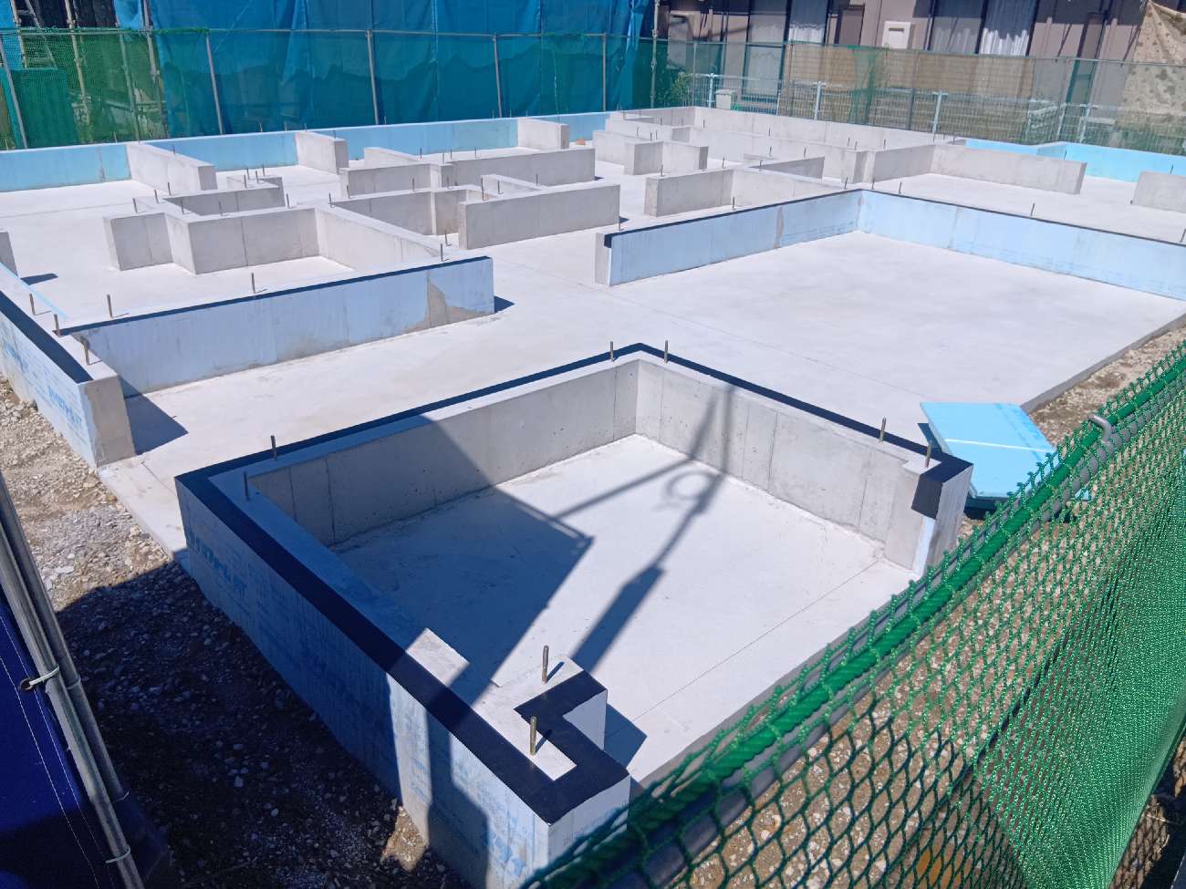 建物基礎が完成しました。床下の設備配管を行った後、構造躯体工事の準備に取り掛かります。