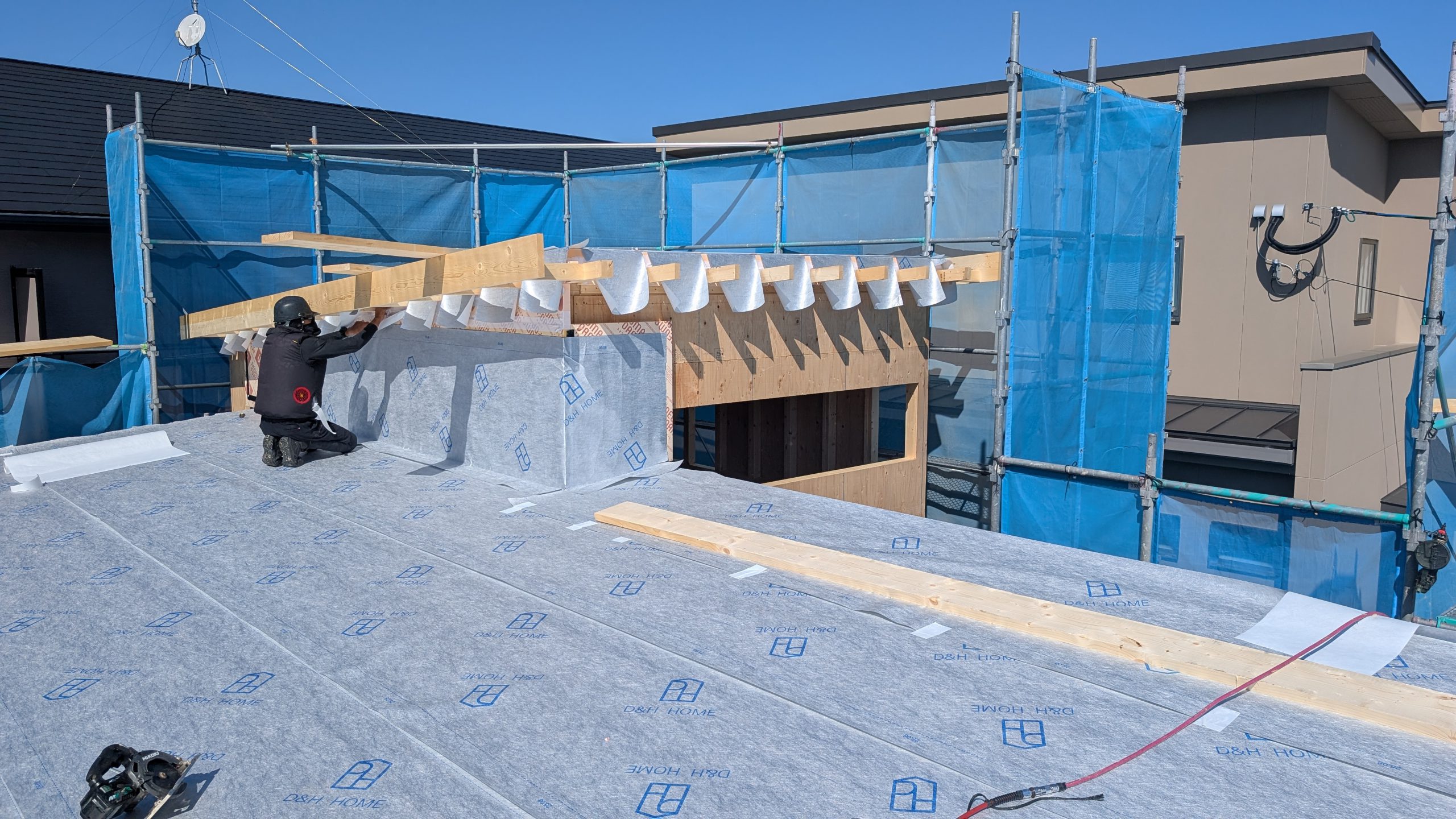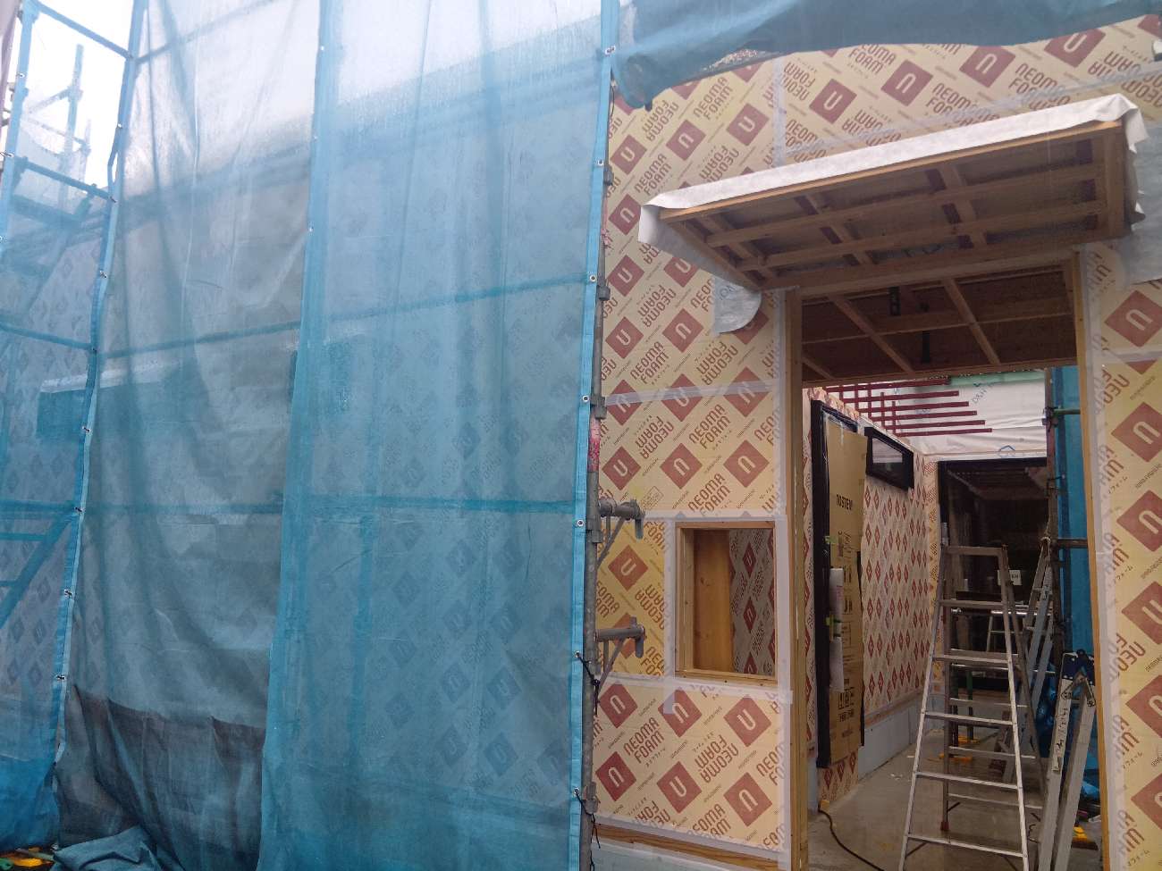 外壁の断熱工事が進んでいます。弊社ではネオマフォームと呼ばれる厚さ30㎜の断熱材(屋根は80㎜)を施します。また、気密性を高めるため、継ぎ目を専用テープで塞ぎます。