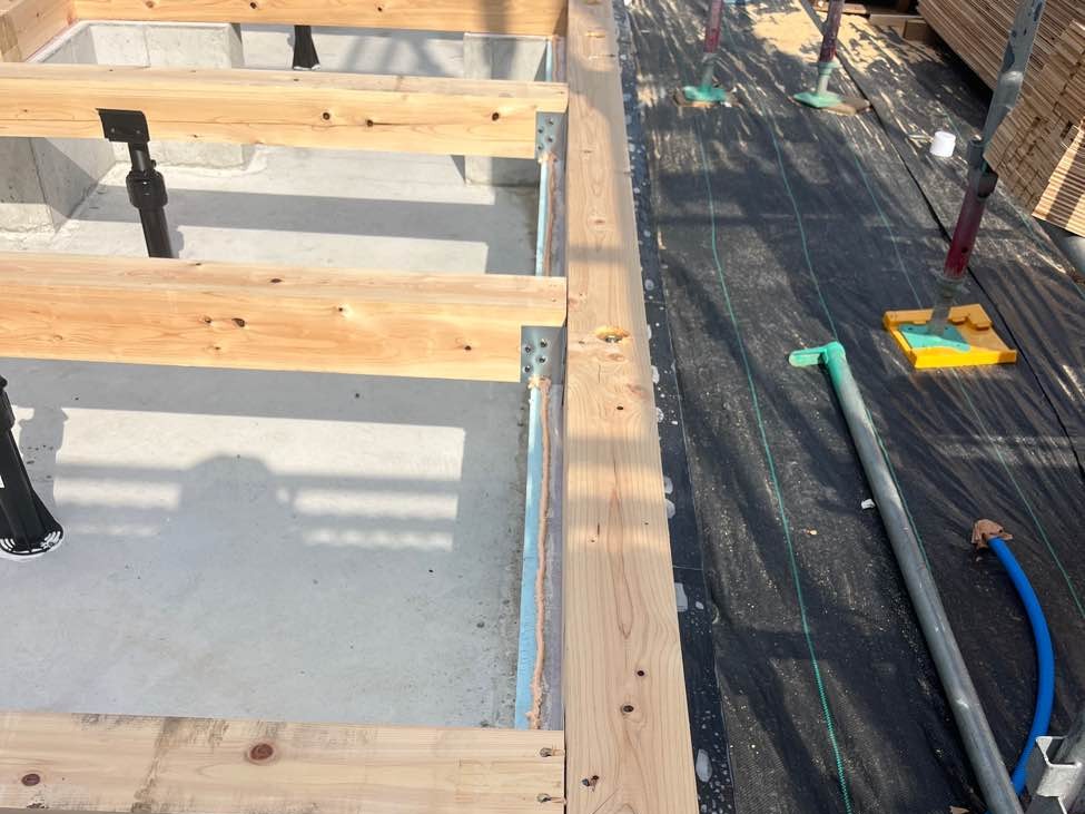 躯体工事に取り掛かりました。基礎の上に土台材を敷き、28㎜の合板を敷き込んで専用の釘で止めていきます。この後いよいよ上棟です!