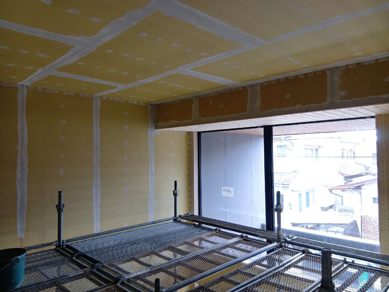クロス工事に取り掛かりました。石膏ボードにパテ処理を施し、平滑な面をつくります。