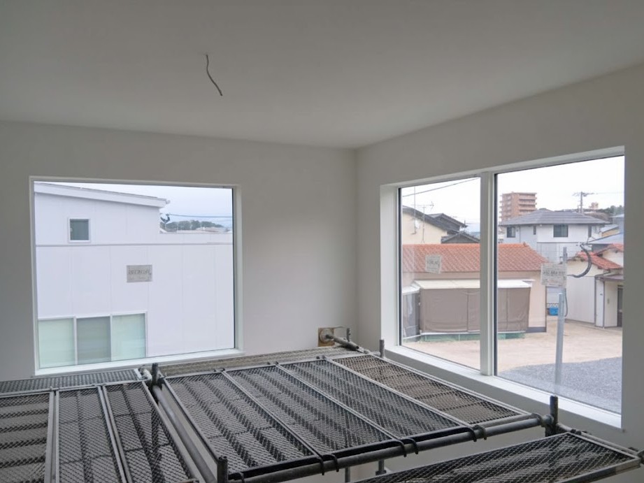躯体工事が完了し、内部造作工事がはじまりました。サッシを取り付け、各所下地工事やフローリング工事へ進んでいきます。