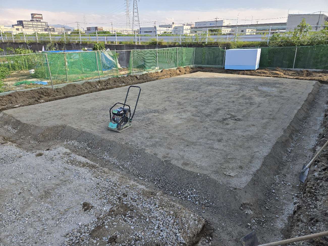 着工しました。バックホーにより、建物基礎の下部の部分を平坦に仕上げ専用機材で転圧を行います。