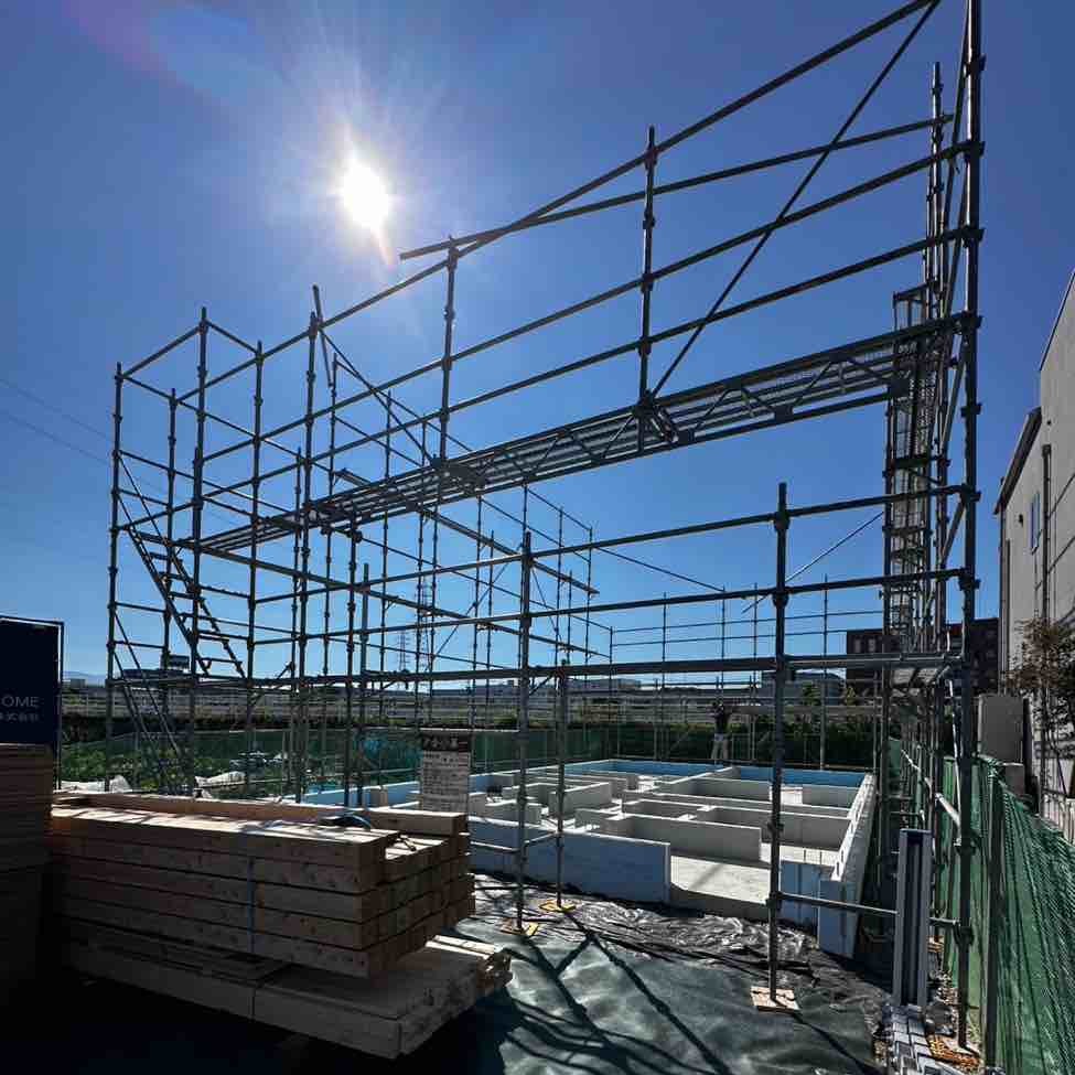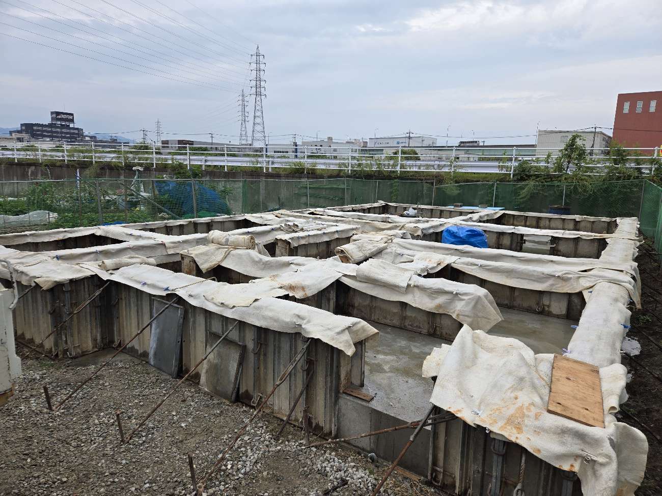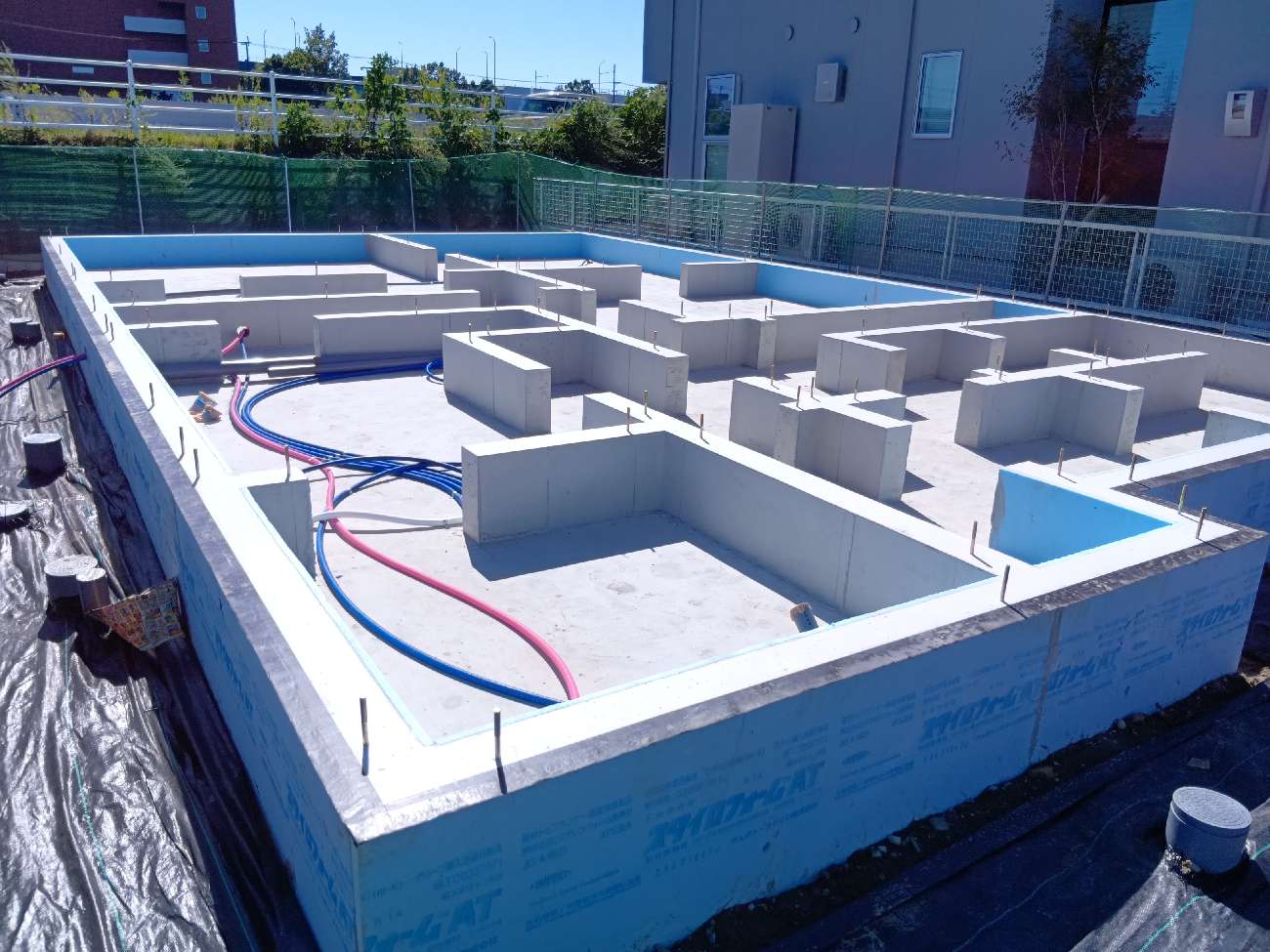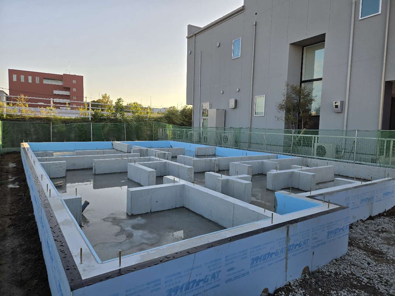 建物基礎が完成しました。床下の設備配管を行った後、構造躯体工事の準備に取り掛かります。