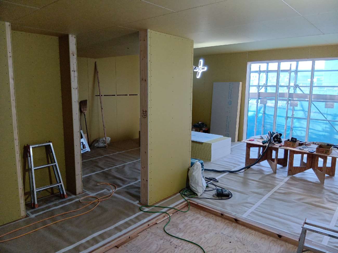 躯体工事が完了し、内部造作工事がはじまりました。サッシを取り付け、各所下地工事やフローリング工事へ進んでいきます。