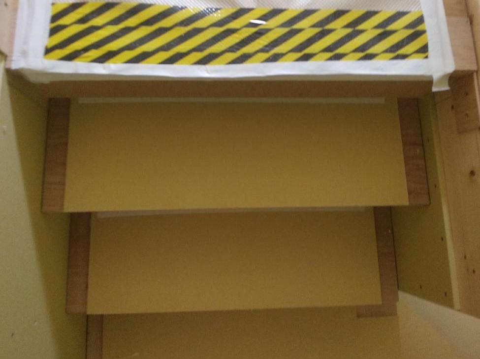 床工事が進んでいます。床材を張り終えた箇所は、シートで保護します。