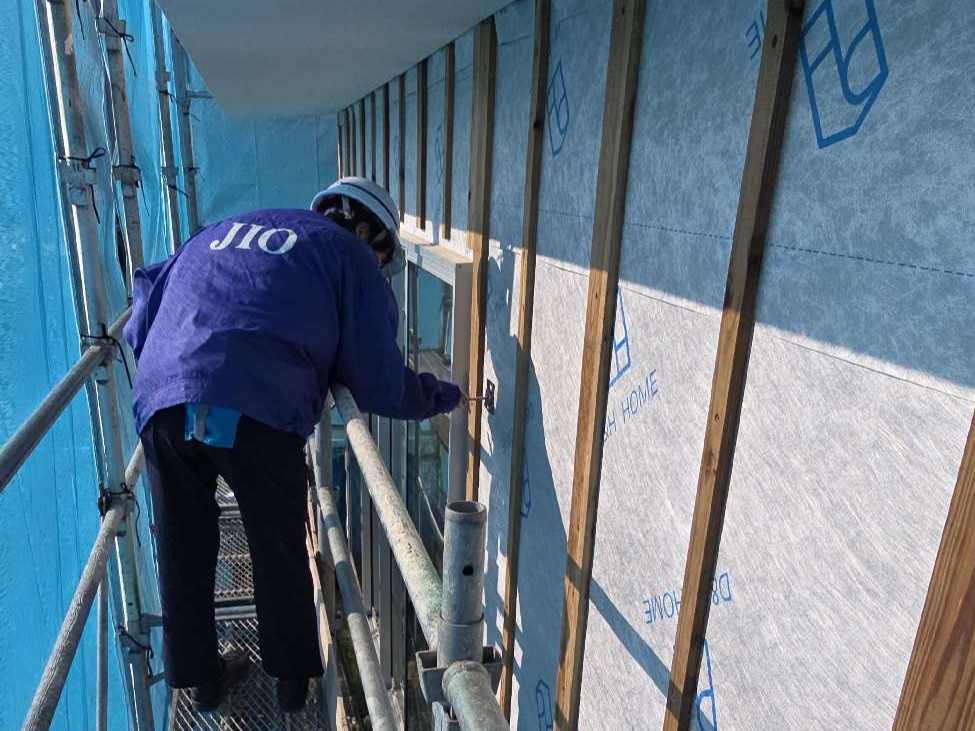 第三者機関である日本住宅保証検査機構(JIO)様の防水下地検査を受けました。断熱材の上に貼ったアクアシルバーウォールシングル(遮熱透湿防水シート)の状態等、各所雨漏りしないかを確認します。