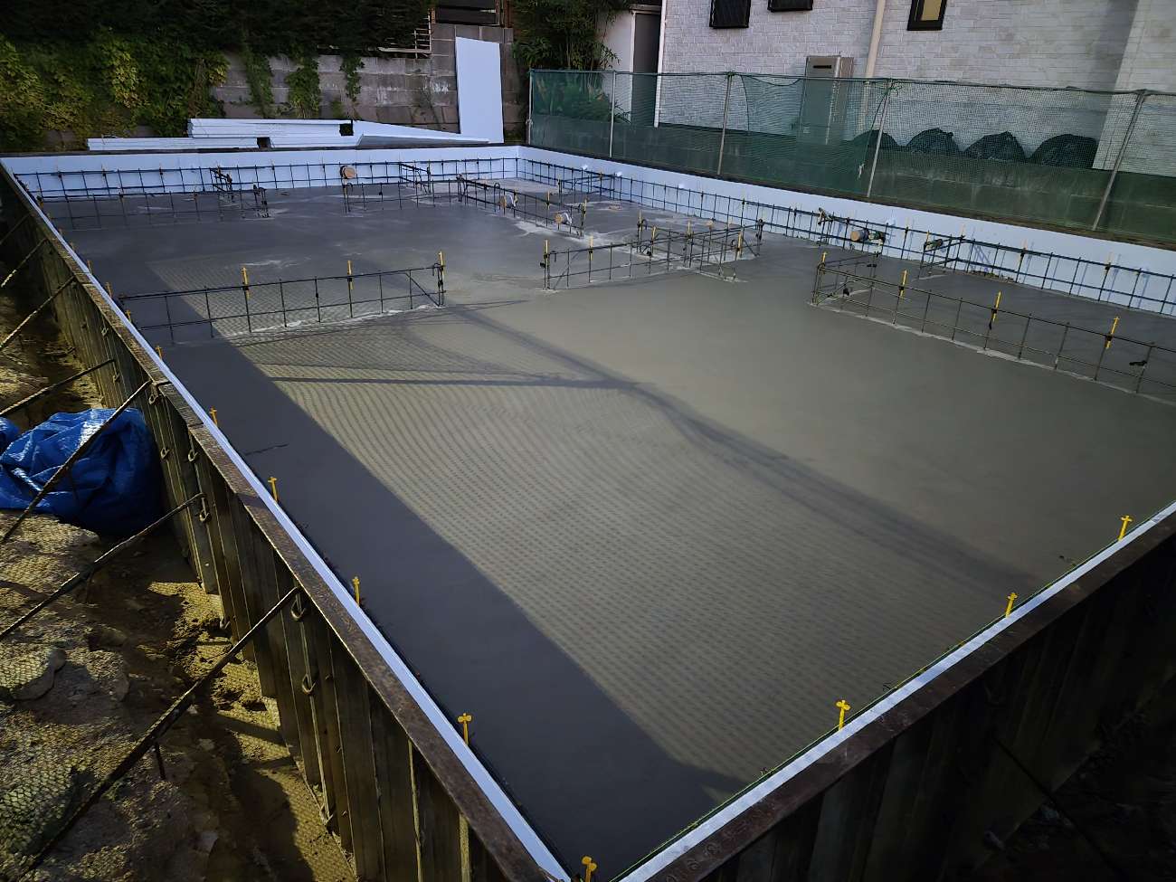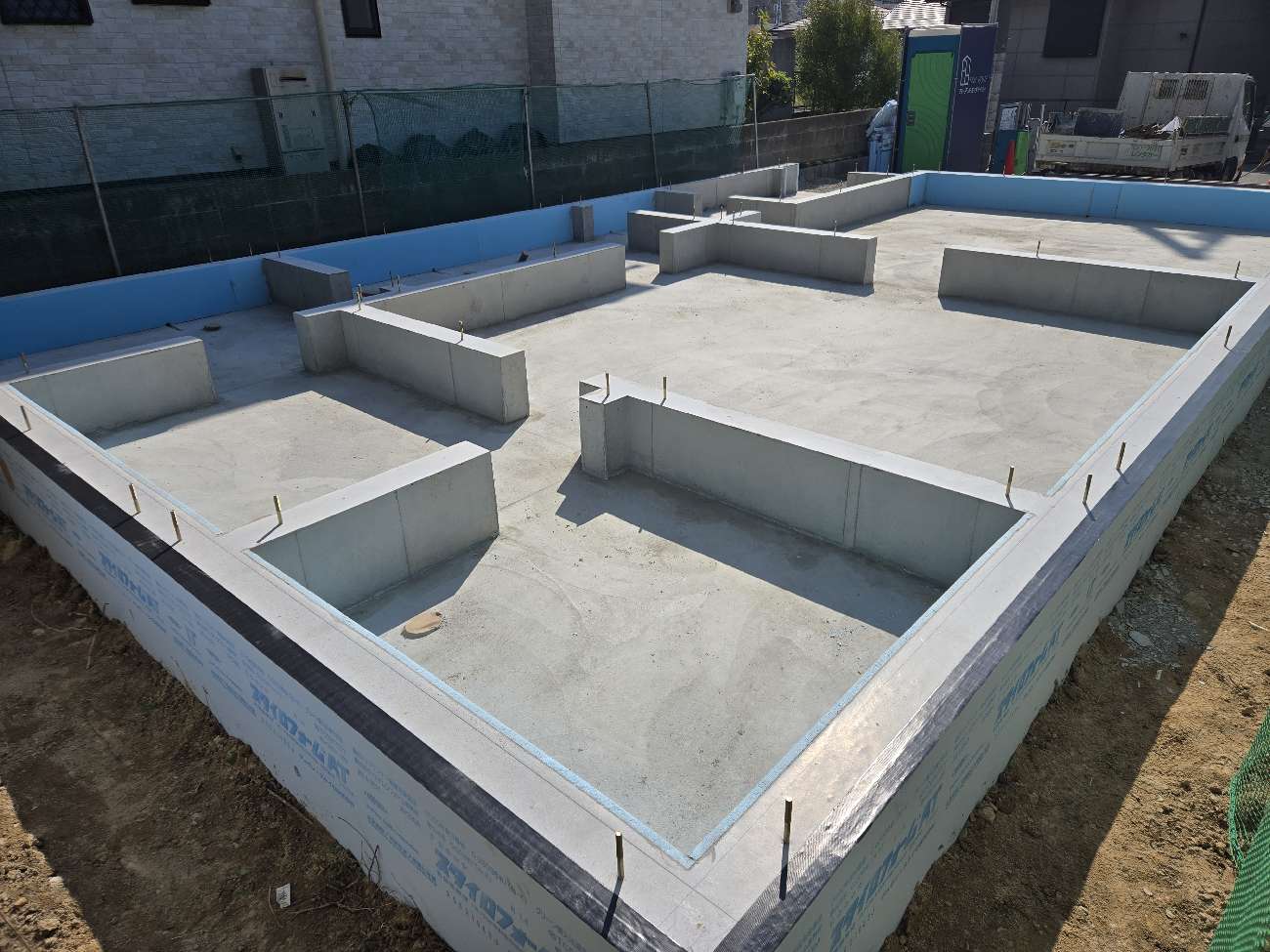 建物基礎が完成しました。床下の設備配管を行った後、構造躯体工事の準備に取り掛かります。