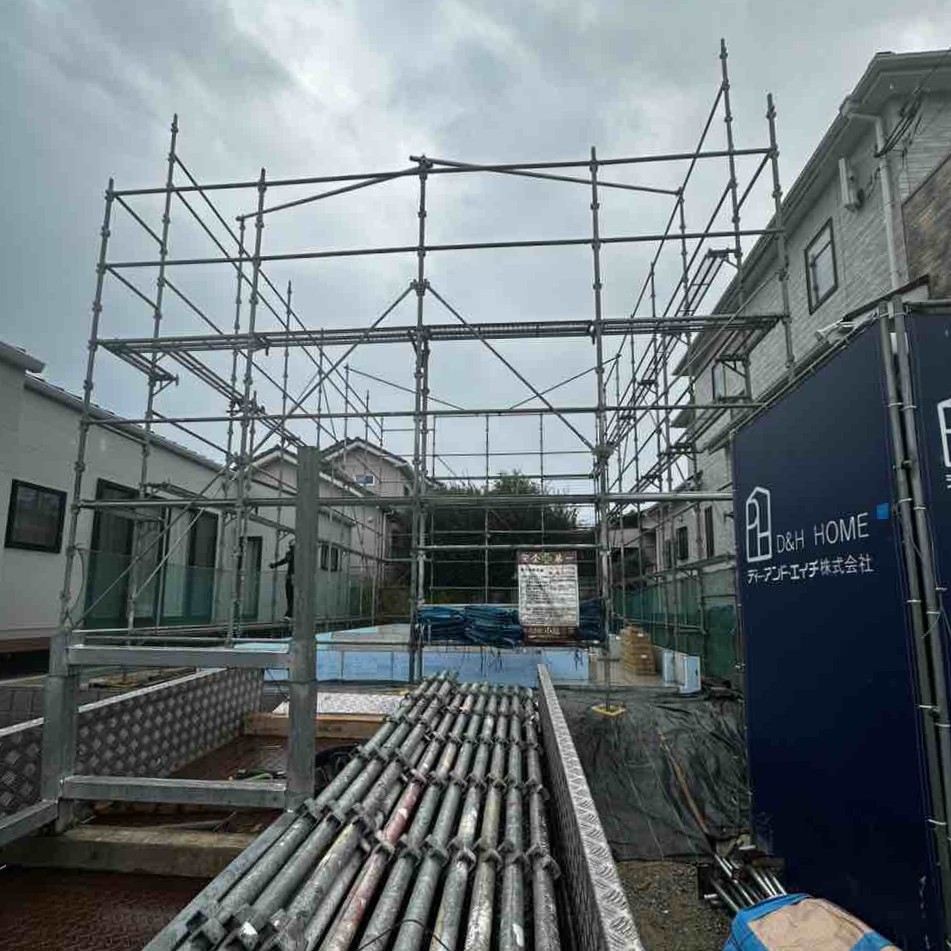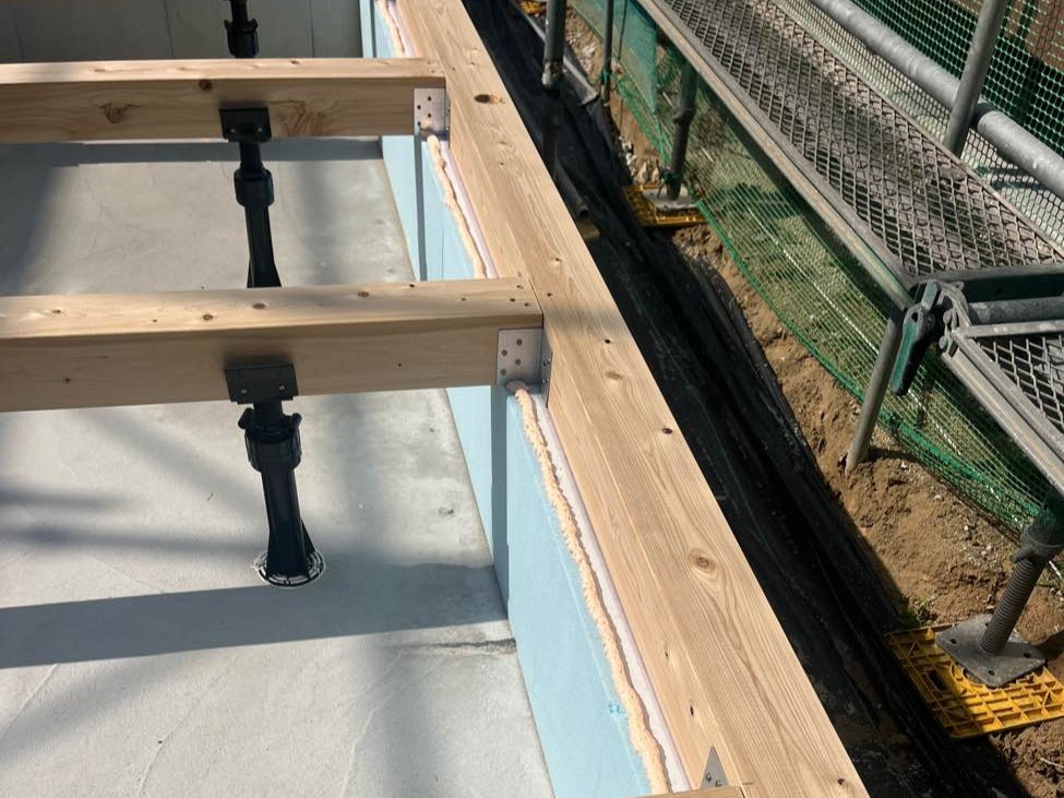 躯体工事に取り掛かりました。基礎の上に土台材を敷き、28㎜の合板を敷き込んで専用の釘で止めていきます。この後いよいよ上棟です!