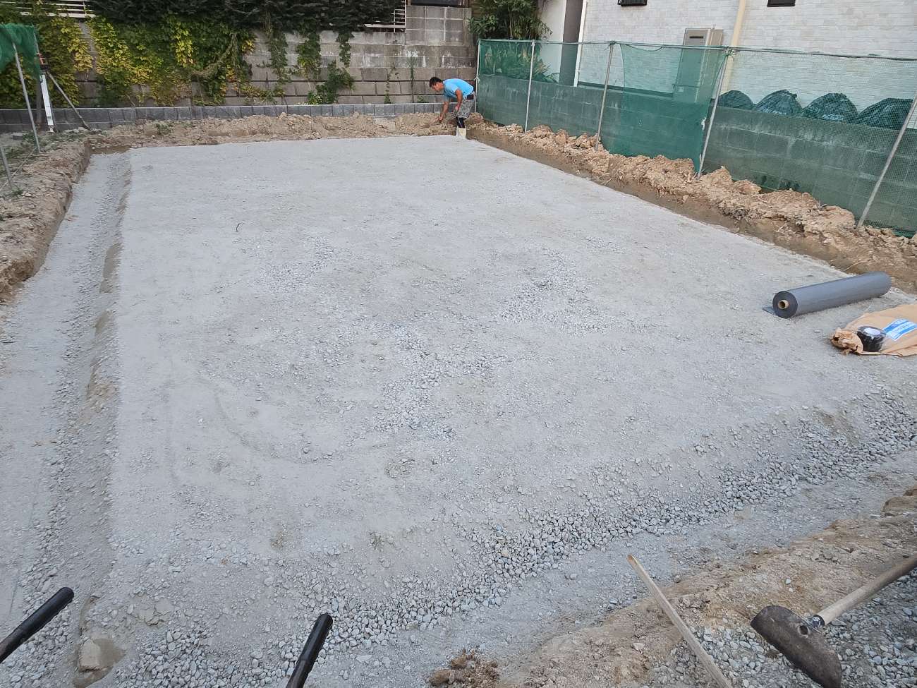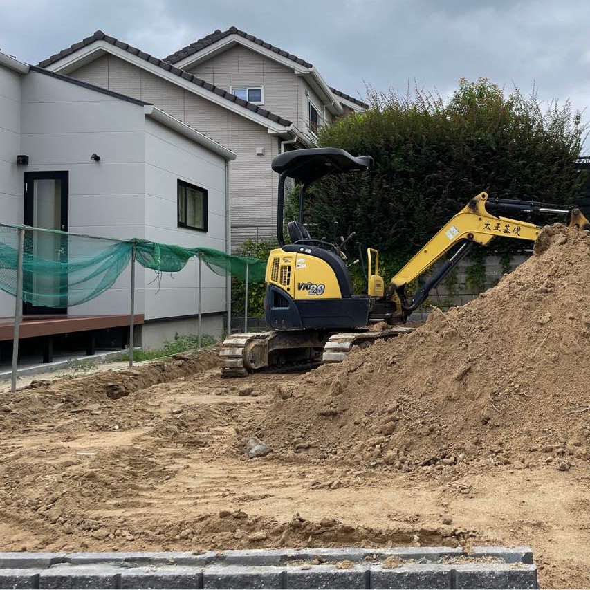 着工しました。バックホーで建物基礎の下部の部分を平坦に仕上げ、専用機材を用いて転圧を行います。