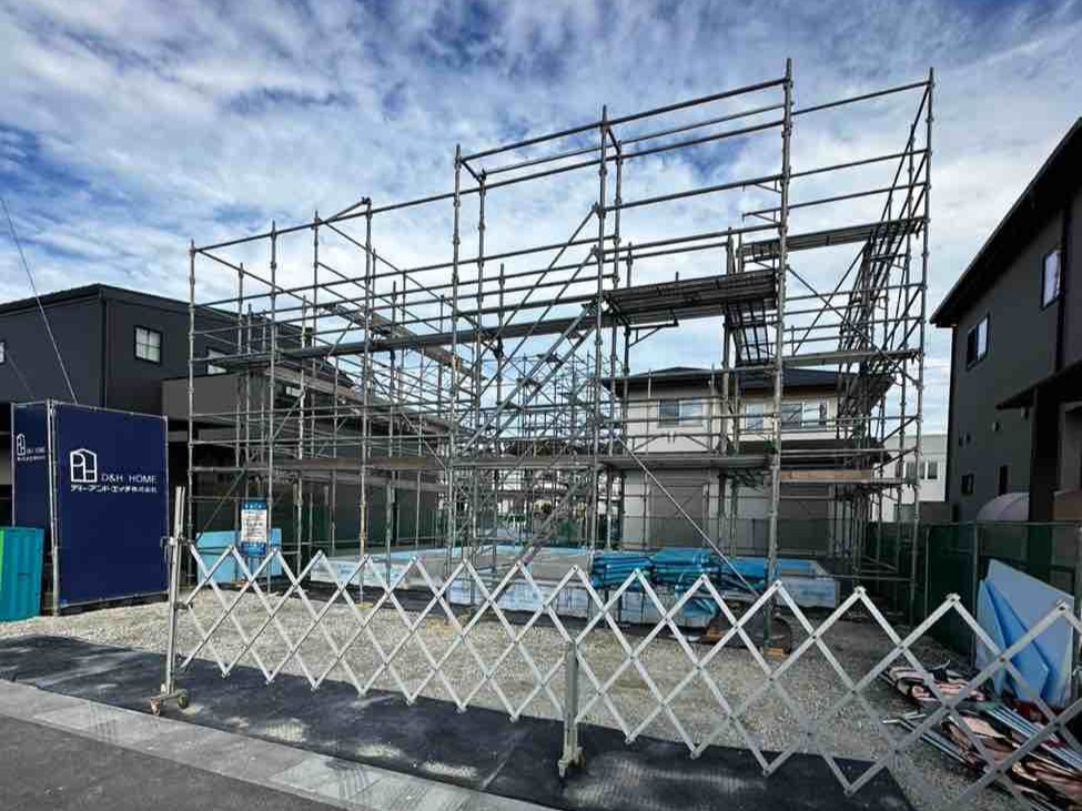躯体工事に先駆けて、外部足場を組み上げています。