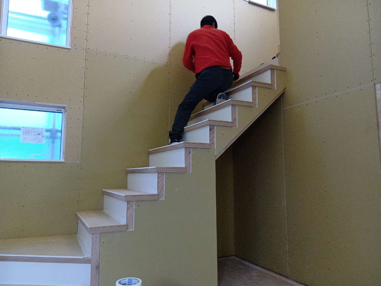 外壁の断熱工事が進んでいます。弊社ではネオマフォームと呼ばれる厚さ45㎜の断熱材(屋根は80㎜)を施します。また、気密性を高めるため、継ぎ目を専用テープで塞ぎます。