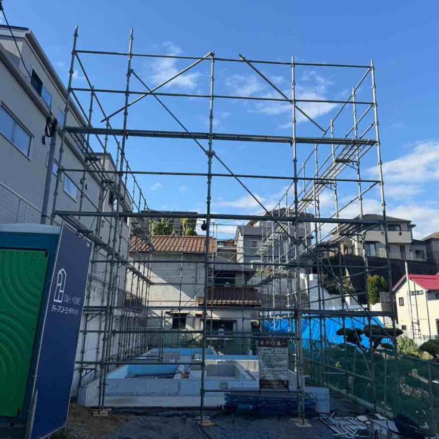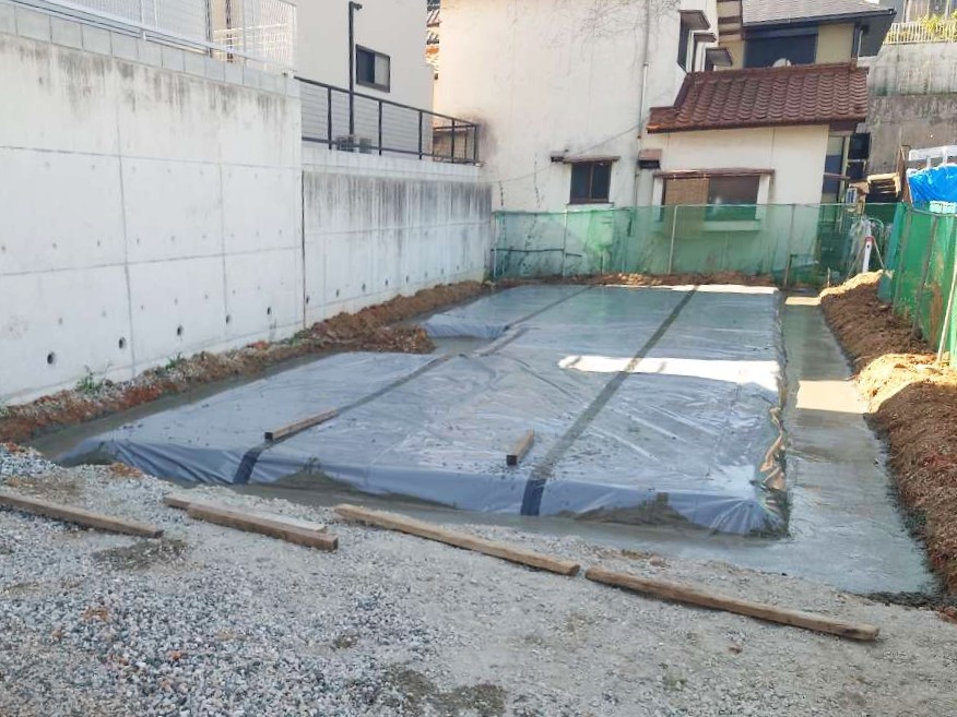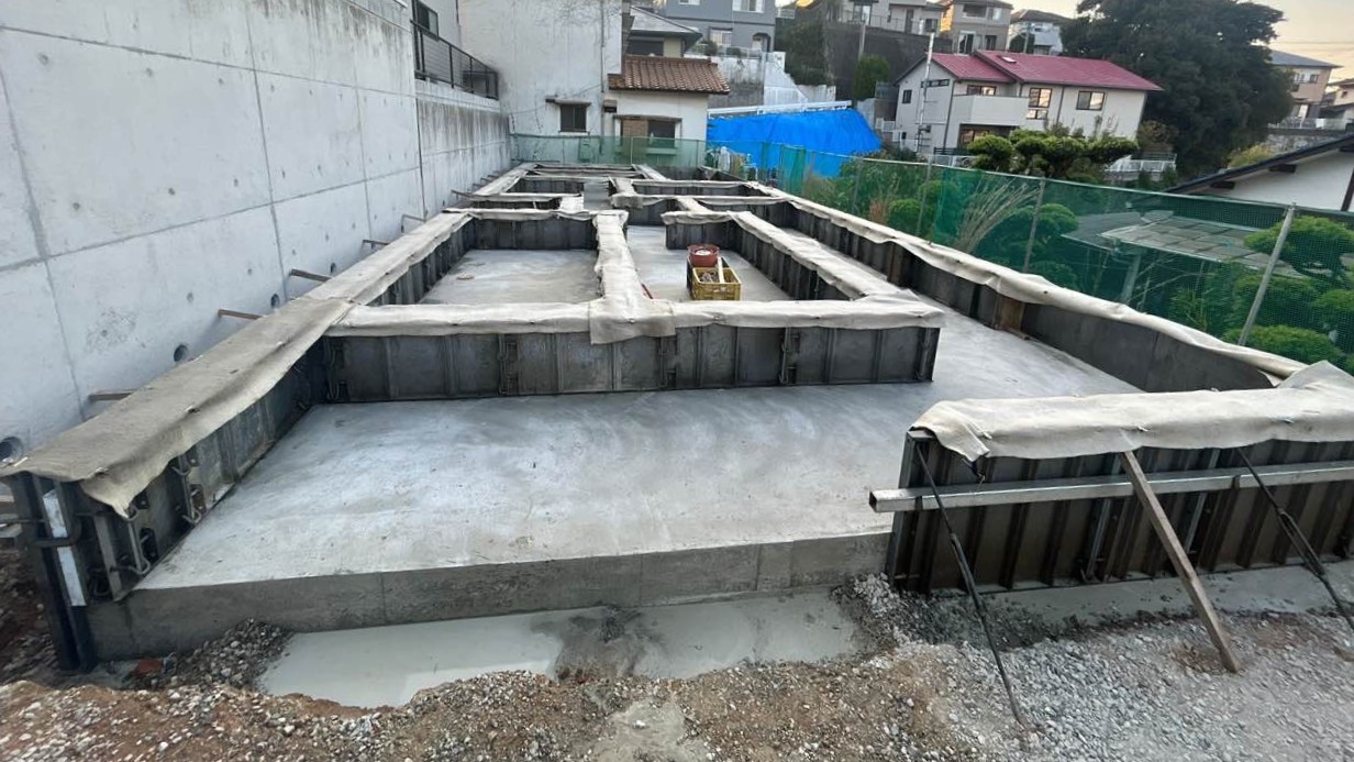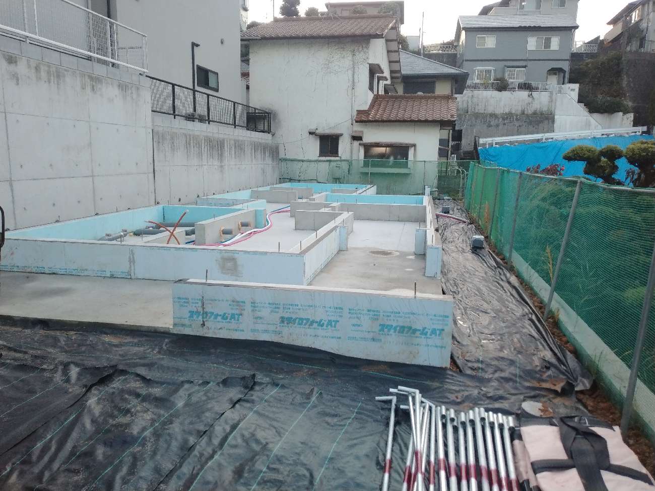 建物基礎が完成しました。床下の設備配管を行った後、構造躯体工事の準備に取り掛かります。