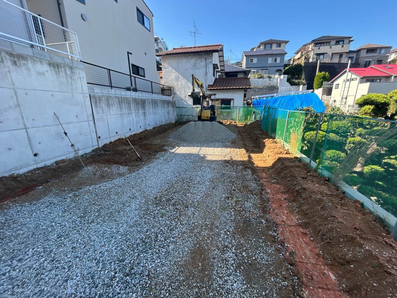 着工しました。バックホーで建物基礎の下部の部分を平坦に仕上げ、専用機材を用いて転圧を行います。