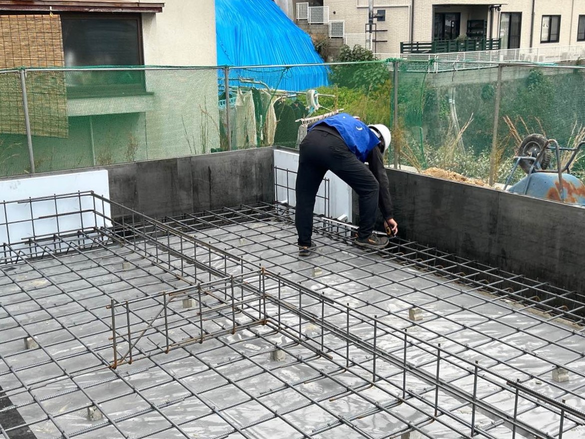 基礎配筋が完了し、第三者機関である日本住宅保証検査機構(JIO)様の配筋検査を受けました。配筋は13㎜異型鉄筋を20㎝間隔で組んでいます。