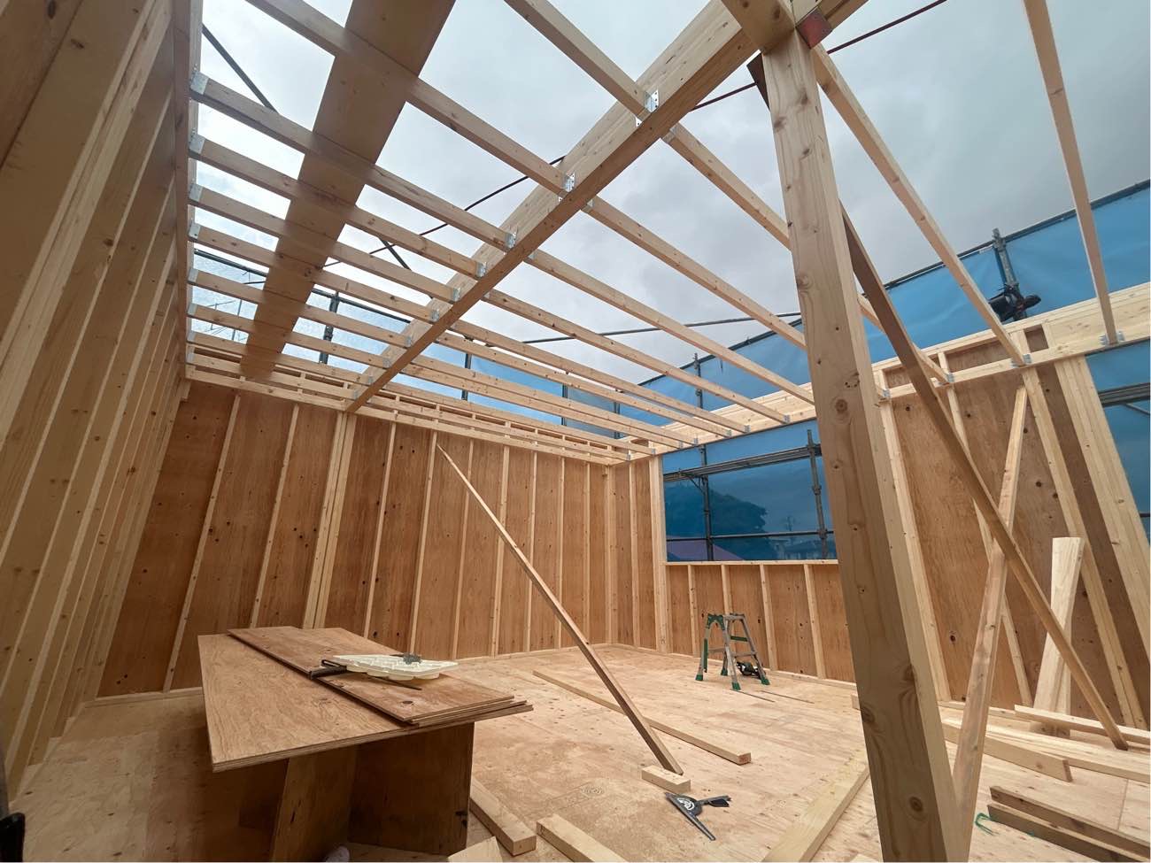 無事に上棟し、内部造作工事がはじまりました。サッシを取り付け、各所下地工事やフローリング工事へ進んでいきます。