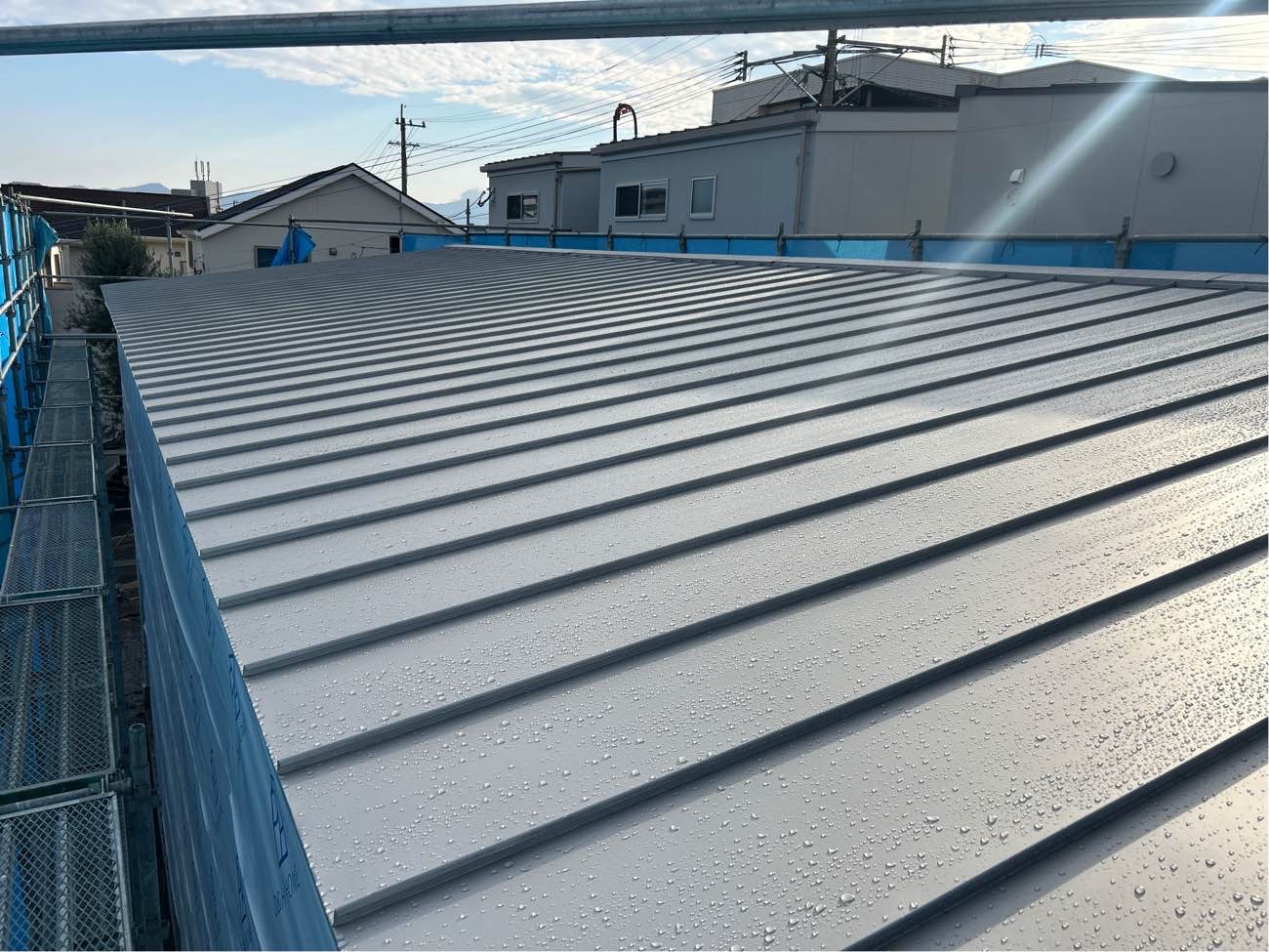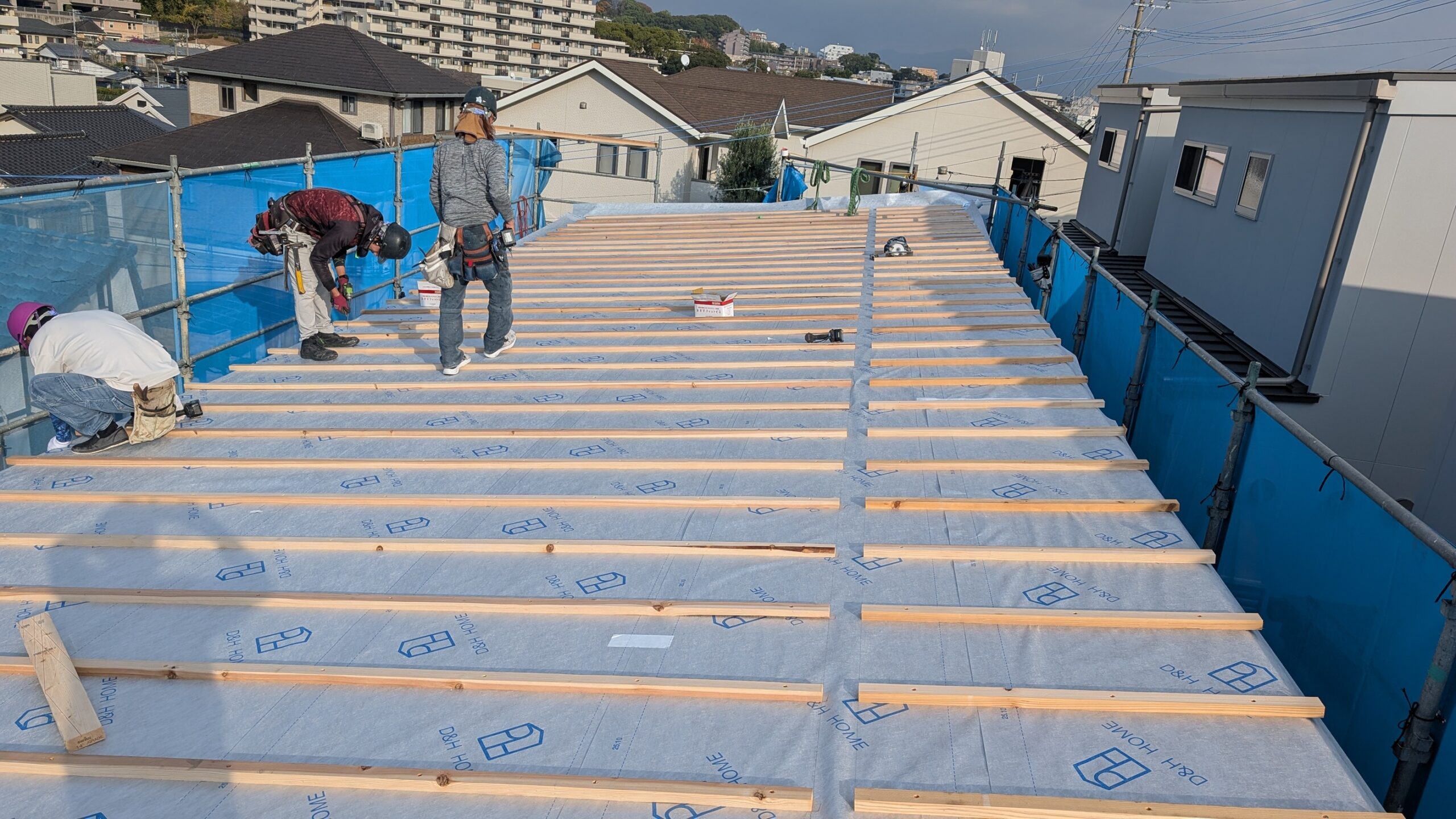 屋根工事が進んでいます。専用下地材(ルーフィング)の上に仕上げ素材を施しています。