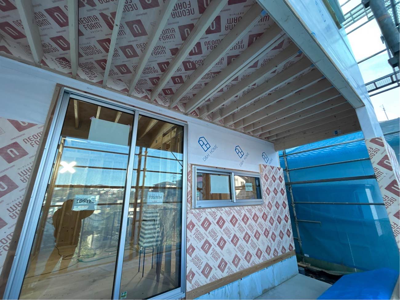 外壁の断熱工事が進んでいます。弊社ではネオマフォームと呼ばれる厚さ45㎜の断熱材(屋根は80㎜)を施します。また、気密性を高めるため、継ぎ目を専用テープで塞ぎます。