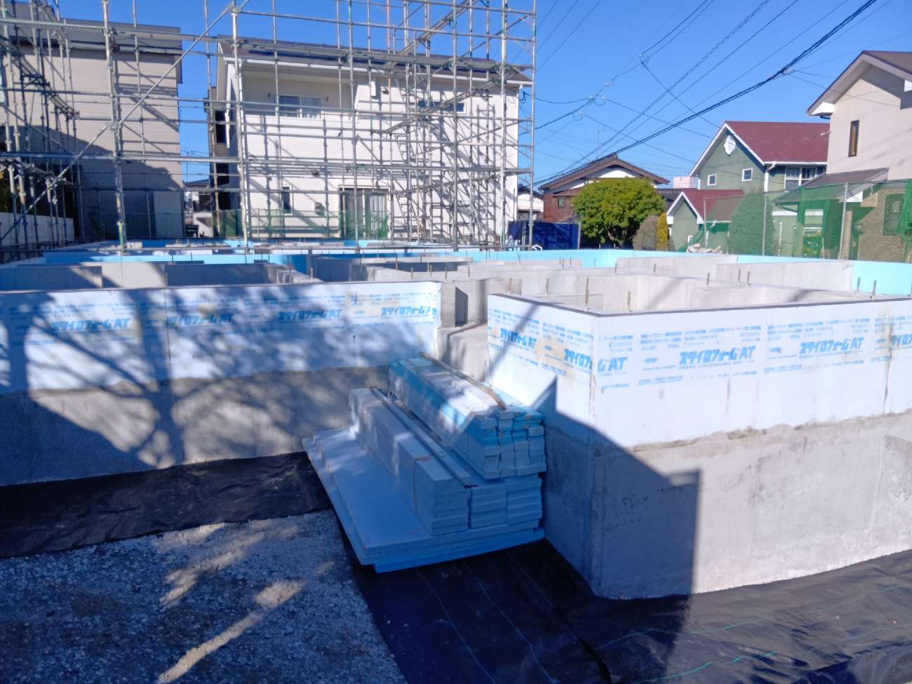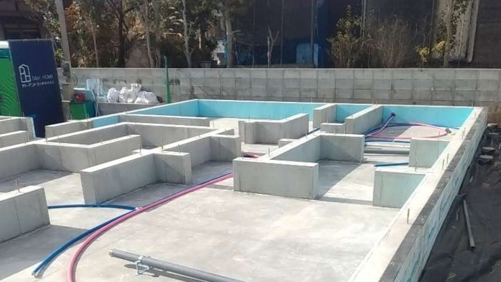 建物基礎が完成しました。床下の設備配管を行った後、構造躯体工事の準備に取り掛かります。