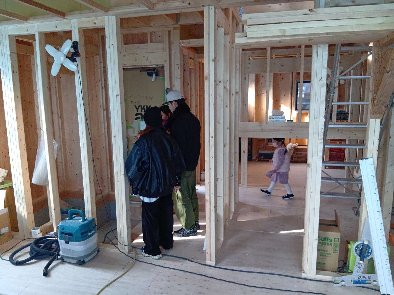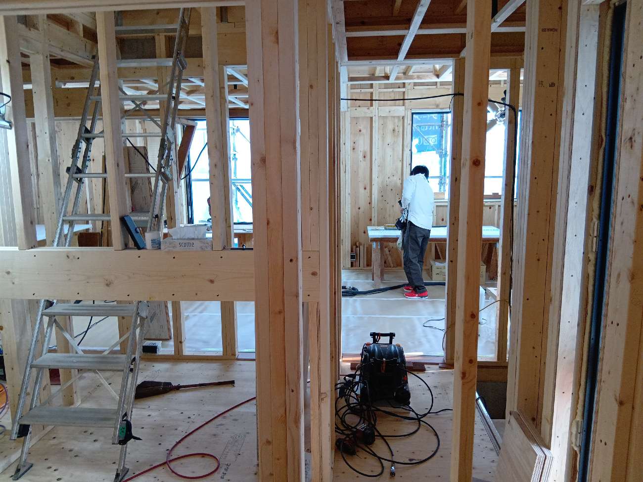 無事に上棟し、内部造作工事がはじまりました。サッシを取り付け、各所下地工事やフローリング工事へ進んでいきます。