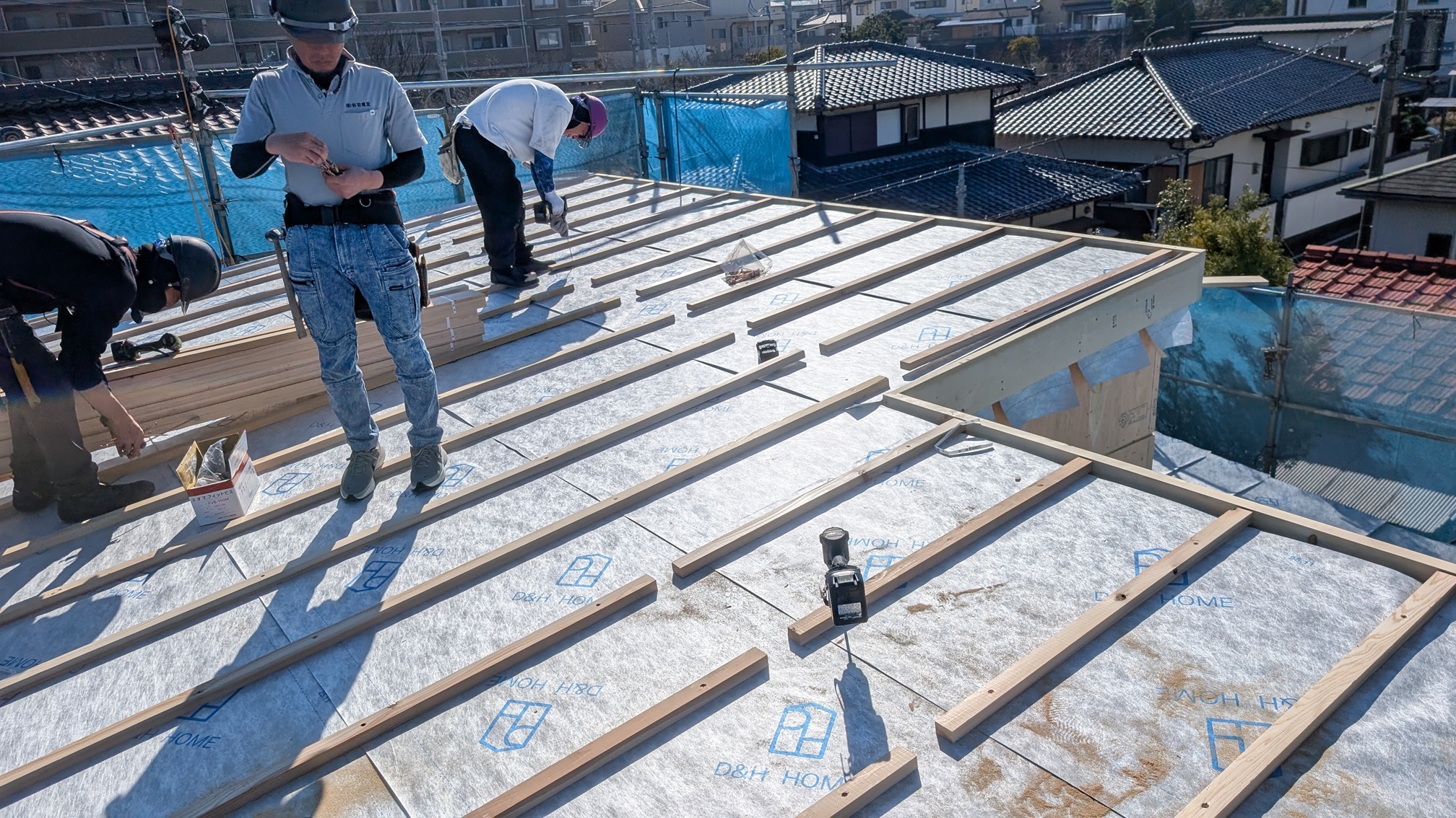 第三者機関である日本住宅保証検査機構(JIO)様の防水下地検査を受けました。断熱材の上に貼ったアクアシルバーウォールシングル(遮熱透湿防水シート)の状態等、各所雨漏りしないかを確認します。