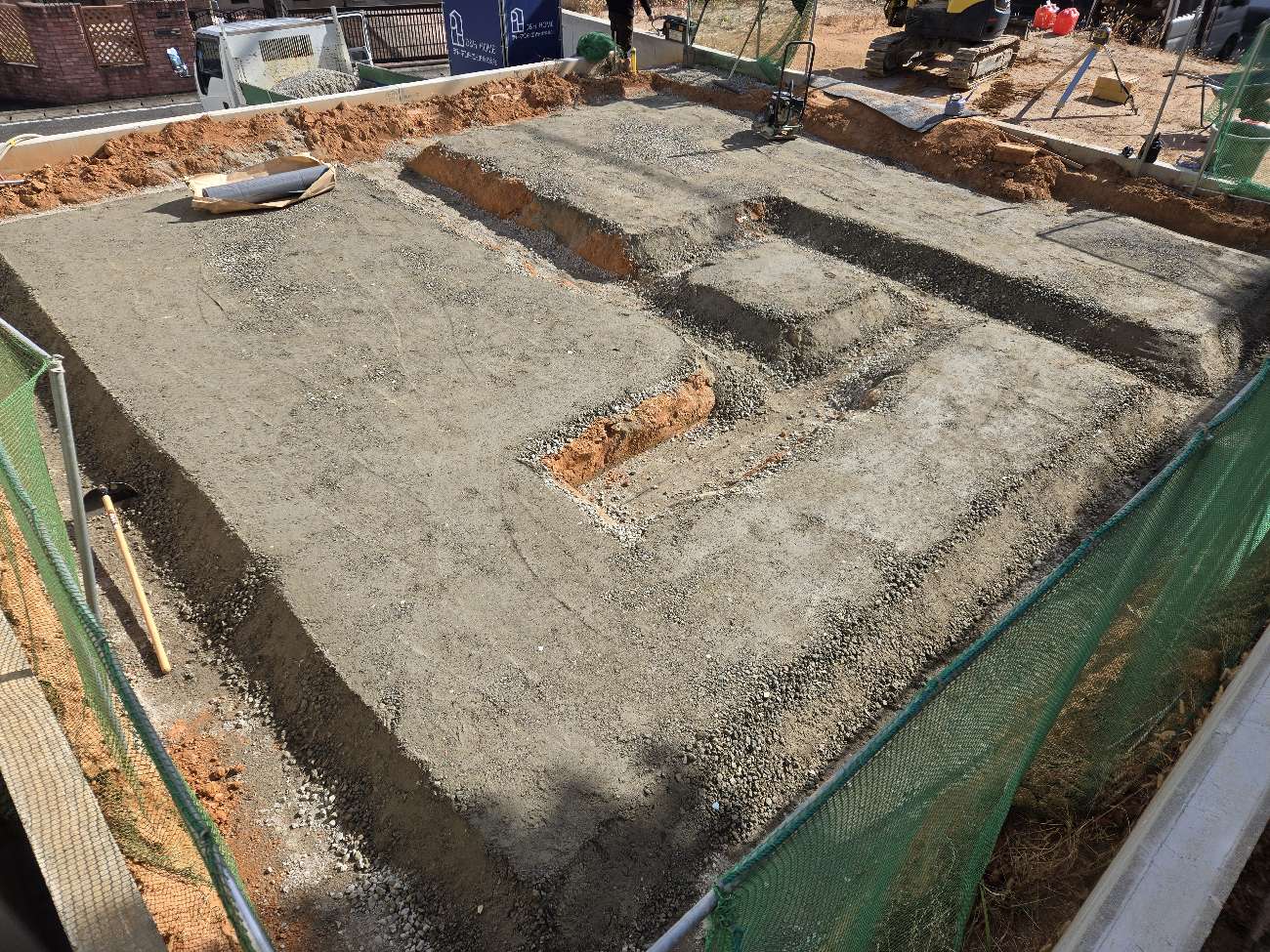 着工しました。バックホーで建物基礎の下部の部分を平坦に仕上げ、専用機材を用いて転圧を行います。
