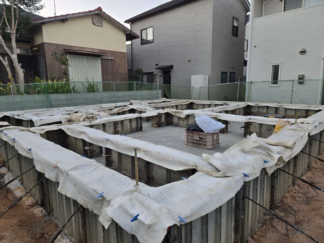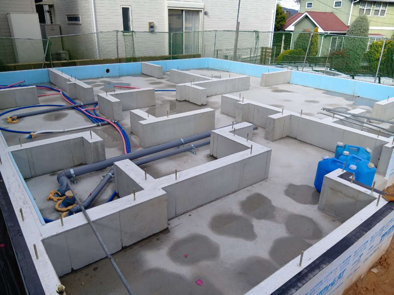 建物基礎が完成しました。床下の設備配管を行った後、構造躯体工事の準備に取り掛かります。