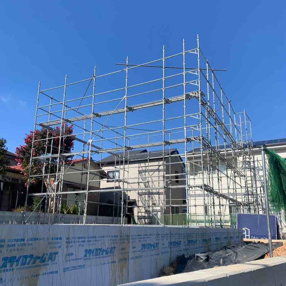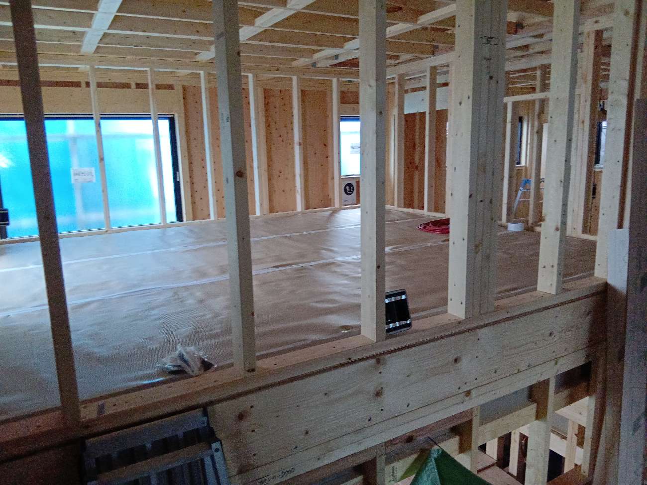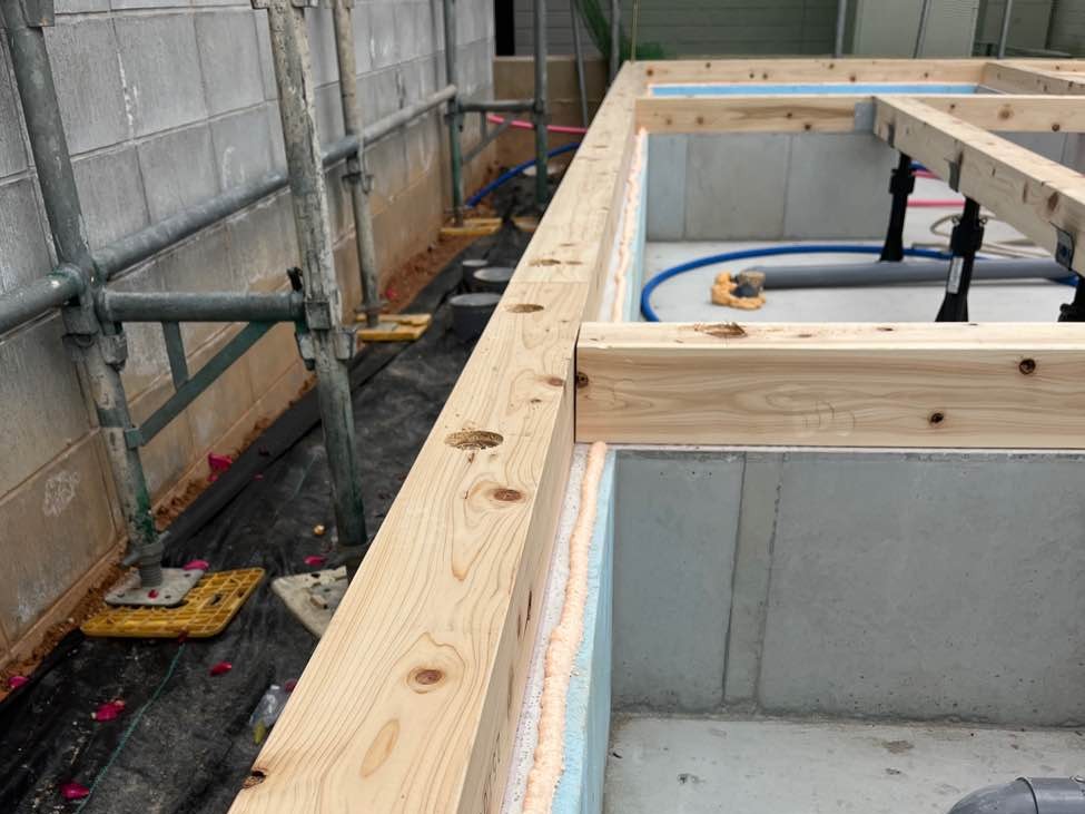 躯体工事に取り掛かりました。基礎の上に土台材を敷き、28㎜の合板を敷き込んで専用の釘で止めていきます。この後いよいよ上棟です!