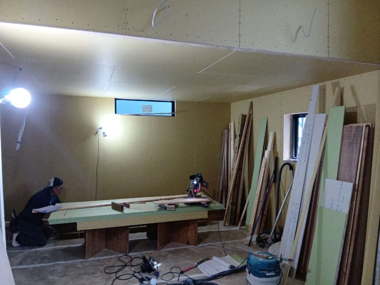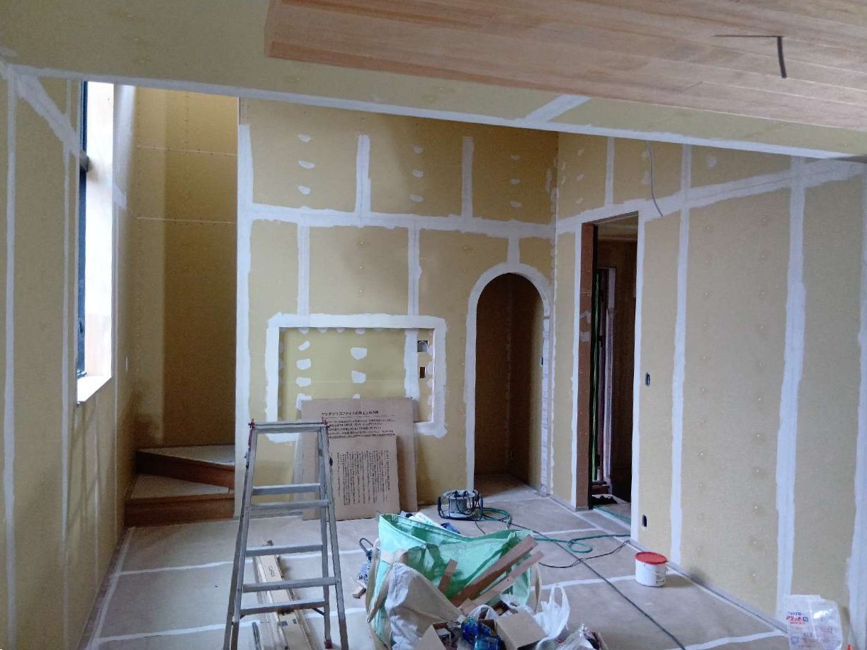 クロス工事に取り掛かりました。石膏ボードにパテ処理を施し、平滑な面をつくります。