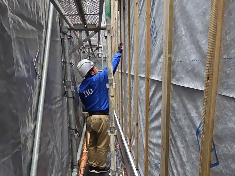 第三者機関である日本住宅保証検査機構(JIO)様の防水下地検査を受けました。断熱材の上に貼ったアクアシルバーウォールシングル(遮熱透湿防水シート)の状態等、各所雨漏りしないかを確認します。