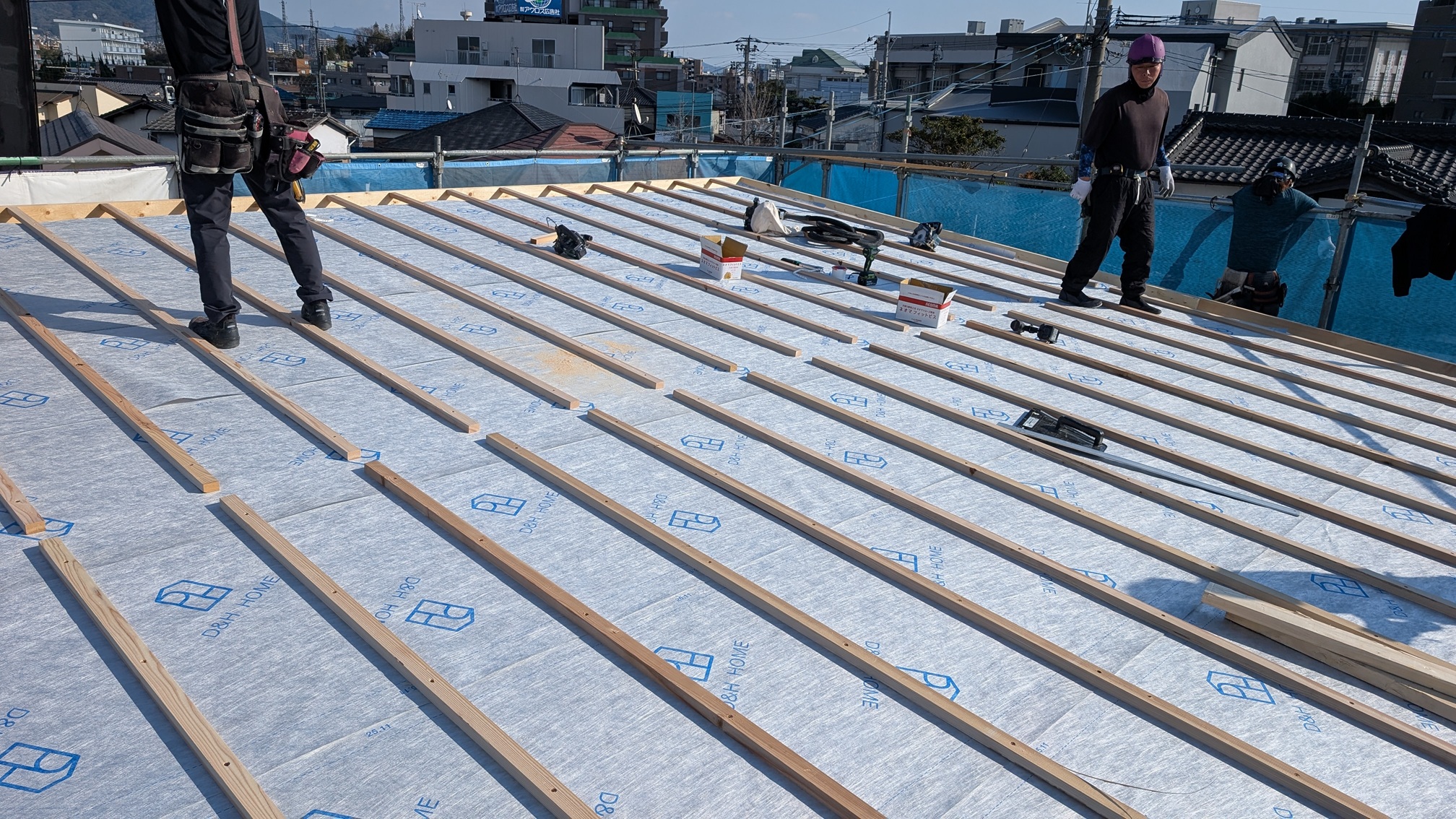 上棟作業が進んでいます。専属の大工さんがクレーン車を使い、構造体を組み立てていきます。