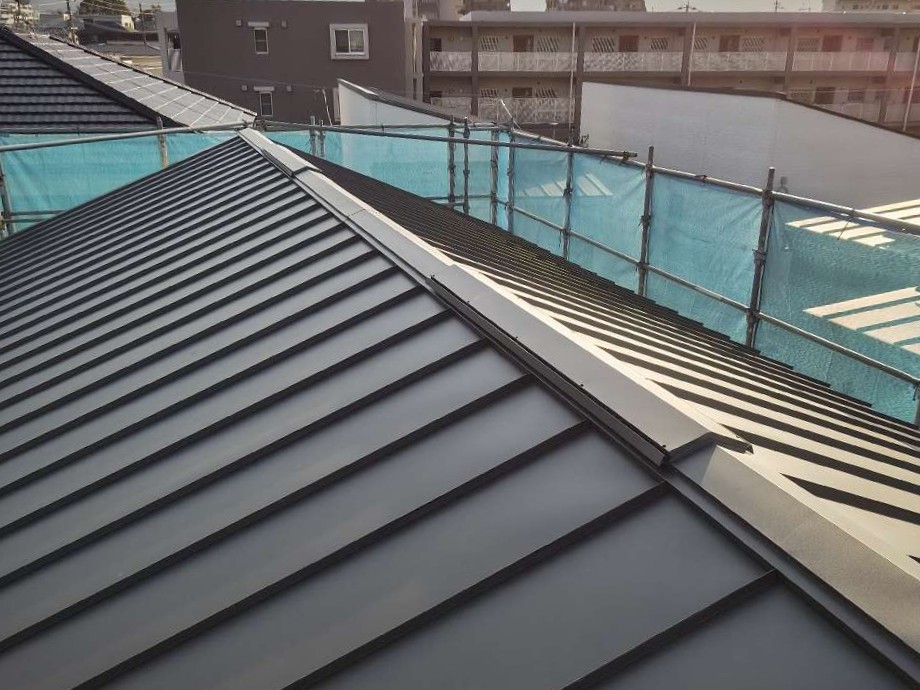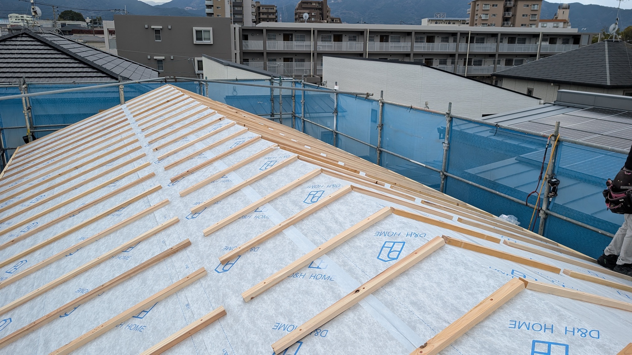 屋根工事が進んでいます。専用下地材(ルーフィング)の上に仕上げ素材を施しています。