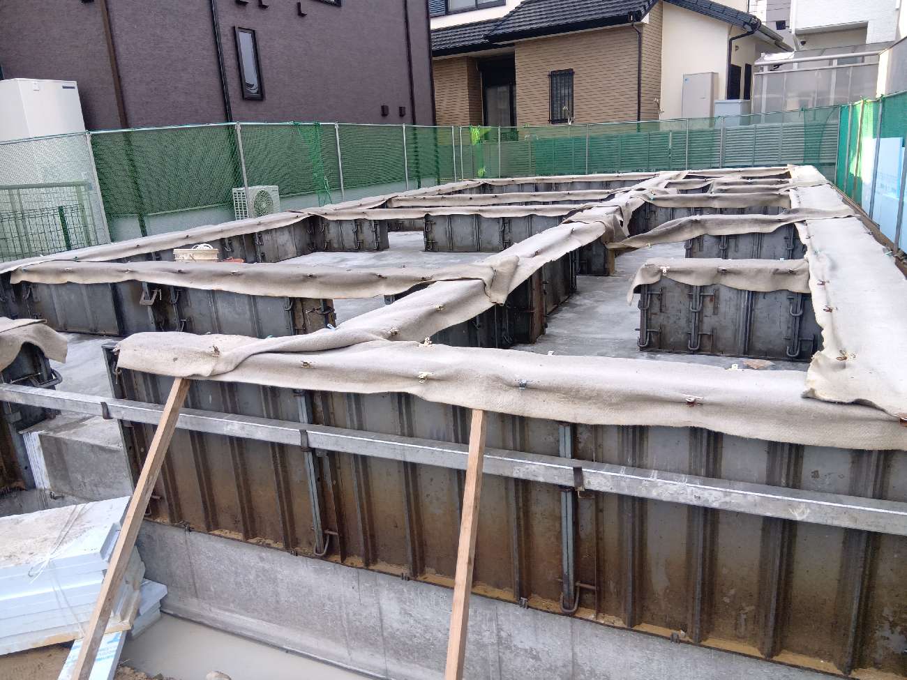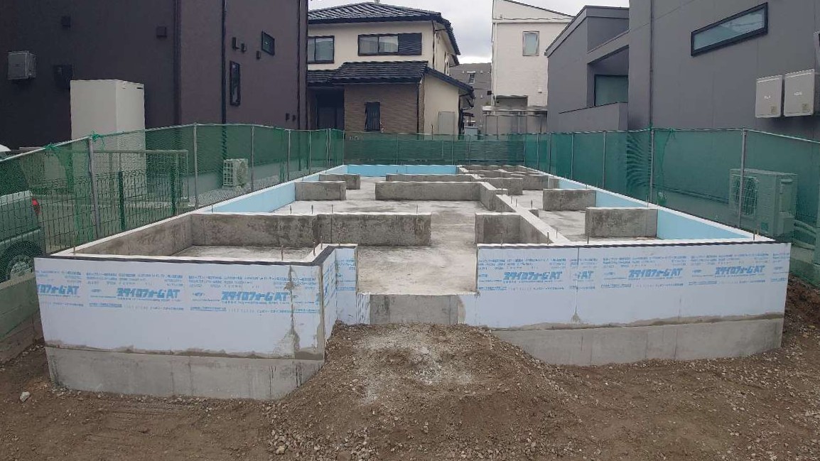 建物基礎が完成しました。床下の設備配管を行った後、構造躯体工事の準備に取り掛かります。
