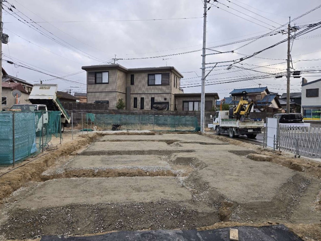 着工しました。バックホーで建物基礎の下部の部分を平坦に仕上げ、専用機材を用いて転圧を行います。