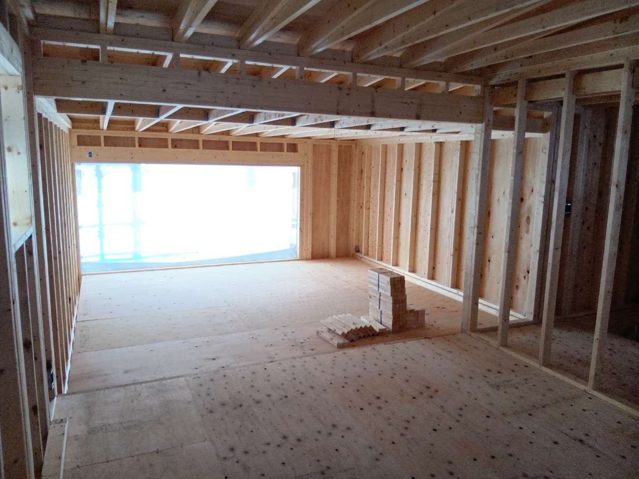 躯体工事に取り掛かりました。基礎の上に土台材を敷き、28㎜の合板を敷き込んで専用の釘で止めていきます。この後いよいよ上棟です!